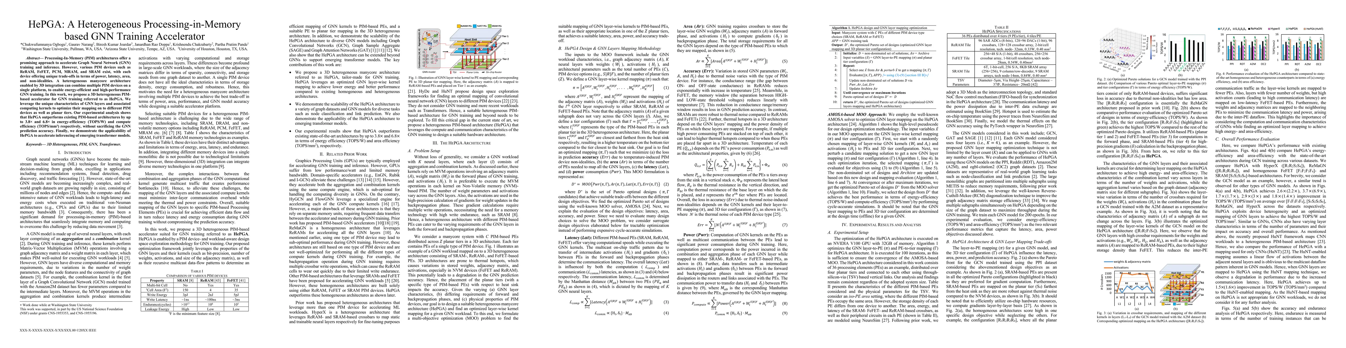 Processing-In-Memory (PIM) architectures offer a promising approach to accelerate Graph Neural Network (GNN) training and inference. However, various PIM devices such as ReRAM, FeFET, PCM, MRAM, and SRAM exist, with each device offering unique trade-offs in terms of power, latency, area, and non-idealities. A heterogeneous manycore architecture enabled by 3D integration can combine multiple PIM devices on a single platform, to enable energy-efficient and high-performance GNN training. In this work, we propose a 3D heterogeneous PIM-based accelerator for GNN training referred to as HePGA. We leverage the unique characteristics of GNN layers and associated computing kernels to optimize their mapping on to different PIM devices as well as planar tiers. Our experimental analysis shows that HePGA outperforms existing PIM-based architectures by up to 3.8x and 6.8x in energy-efficiency (TOPS/W) and compute efficiency (TOPS/mm2) respectively, without sacrificing the GNN prediction accuracy. Finally, we demonstrate the applicability of HePGA to accelerate inferencing of emerging transformer models.