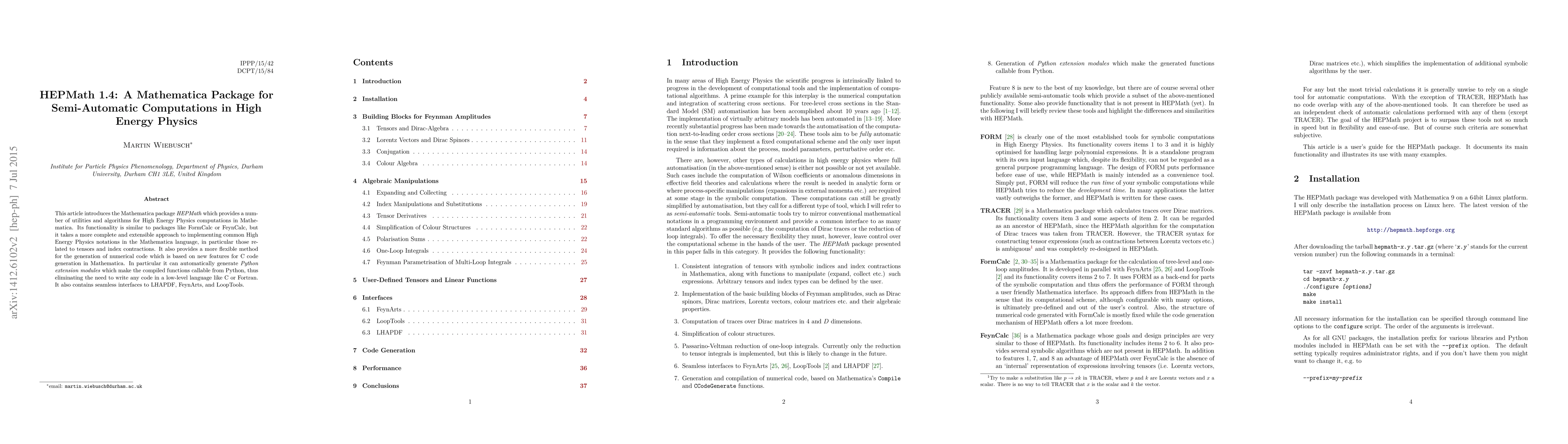 The HEPMath 1.4 Mathematica package offers utilities for high-energy physics computations, focusing on tensors and index contractions, and supports automatic C code generation and Python interoperability. It integrates seamlessly with LHAPDF, FeynArts, and LoopTools.