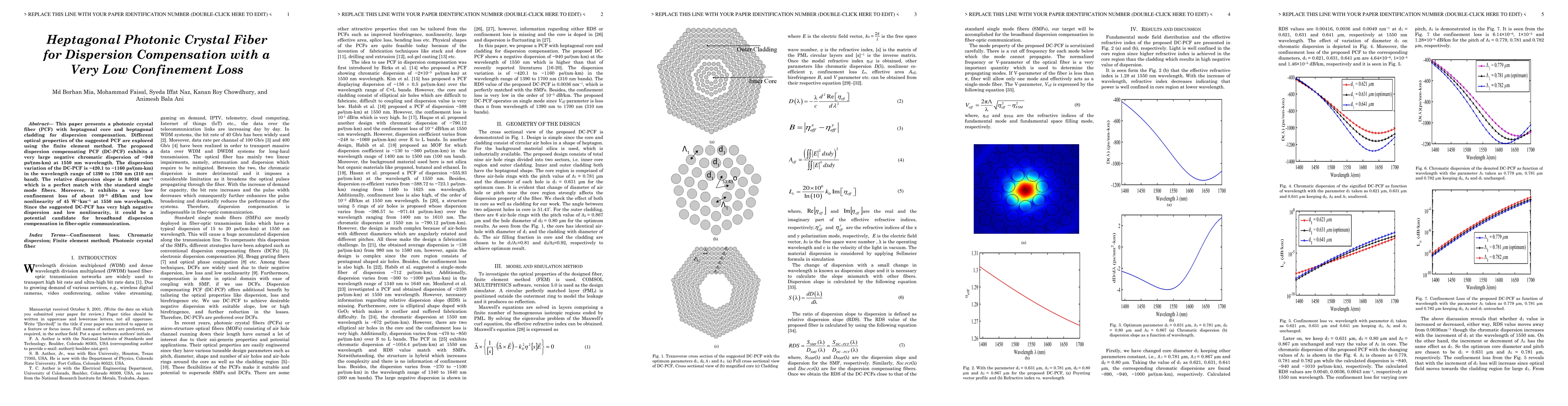 This paper introduces a heptagonal photonic crystal fiber for dispersion compensation with a very low confinement loss, achieving a large negative chromatic dispersion and low nonlinearity, making it a promising candidate for broadband fiber-optic communication.