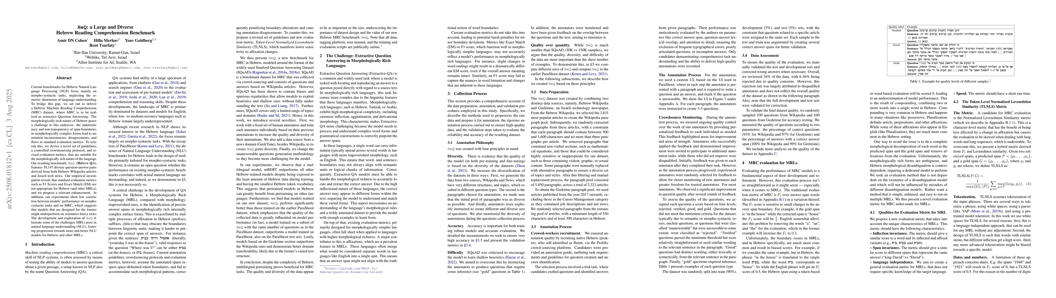 Current benchmarks for Hebrew Natural Language Processing (NLP) focus mainly on morpho-syntactic tasks, neglecting the semantic dimension of language understanding. To bridge this gap, we set out to deliver a Hebrew Machine Reading Comprehension (MRC) dataset, where MRC is to be realized as extractive Question Answering. The morphologically rich nature of Hebrew poses a challenge to this endeavor: the indeterminacy and non-transparency of span boundaries in morphologically complex forms lead to annotation inconsistencies, disagreements, and flaws in standard evaluation metrics. To remedy this, we devise a novel set of guidelines, a controlled crowdsourcing protocol, and revised evaluation metrics that are suitable for the morphologically rich nature of the language. Our resulting benchmark, HeQ (Hebrew QA), features 30,147 diverse question-answer pairs derived from both Hebrew Wikipedia articles and Israeli tech news. Our empirical investigation reveals that standard evaluation metrics such as F1 scores and Exact Match (EM) are not appropriate for Hebrew (and other MRLs), and we propose a relevant enhancement. In addition, our experiments show low correlation between models' performance on morpho-syntactic tasks and on MRC, which suggests that models designed for the former might underperform on semantics-heavy tasks. The development and exploration of HeQ illustrate some of the challenges MRLs pose in natural language understanding (NLU), fostering progression towards more and better NLU models for Hebrew and other MRLs.