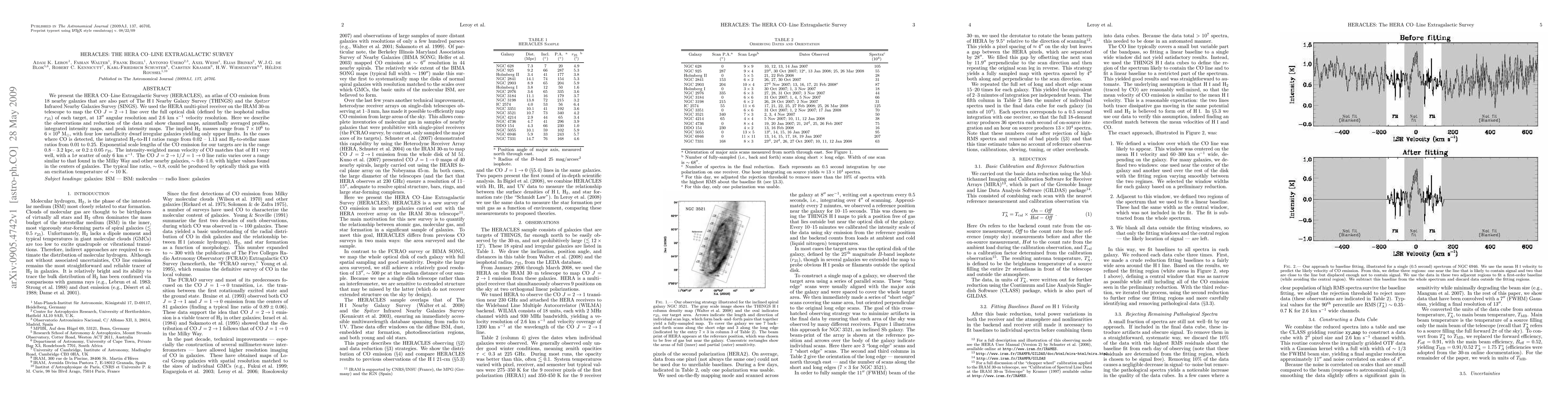 The HERACLES survey maps CO J=2-1 emission in 18 nearby galaxies, revealing H2 masses ranging from 7 \times 10^6 to 6 \times 10^9 M_sun and H2-to-HI ratios from 0.02 to 1.13. The CO emission scale lengths are 0.8 - 3.2 kpc, closely matching HI velocity profiles.