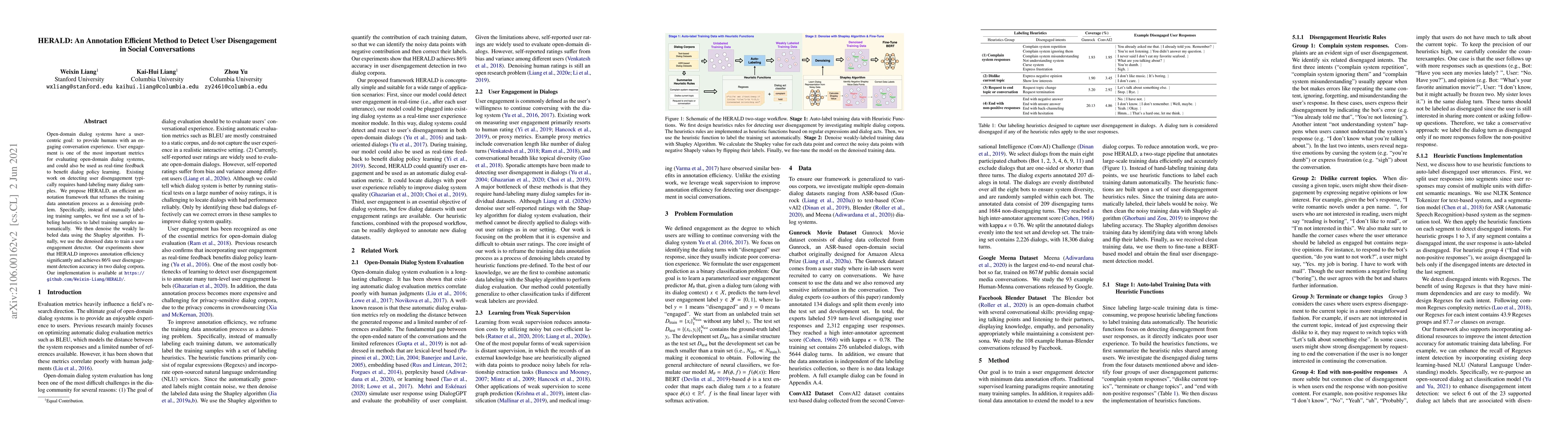 Open-domain dialog systems have a user-centric goal: to provide humans with an engaging conversation experience. User engagement is one of the most important metrics for evaluating open-domain dialog systems, and could also be used as real-time feedback to benefit dialog policy learning. Existing work on detecting user disengagement typically requires hand-labeling many dialog samples. We propose HERALD, an efficient annotation framework that reframes the training data annotation process as a denoising problem. Specifically, instead of manually labeling training samples, we first use a set of labeling heuristics to label training samples automatically. We then denoise the weakly labeled data using the Shapley algorithm. Finally, we use the denoised data to train a user engagement detector. Our experiments show that HERALD improves annotation efficiency significantly and achieves 86% user disengagement detection accuracy in two dialog corpora.