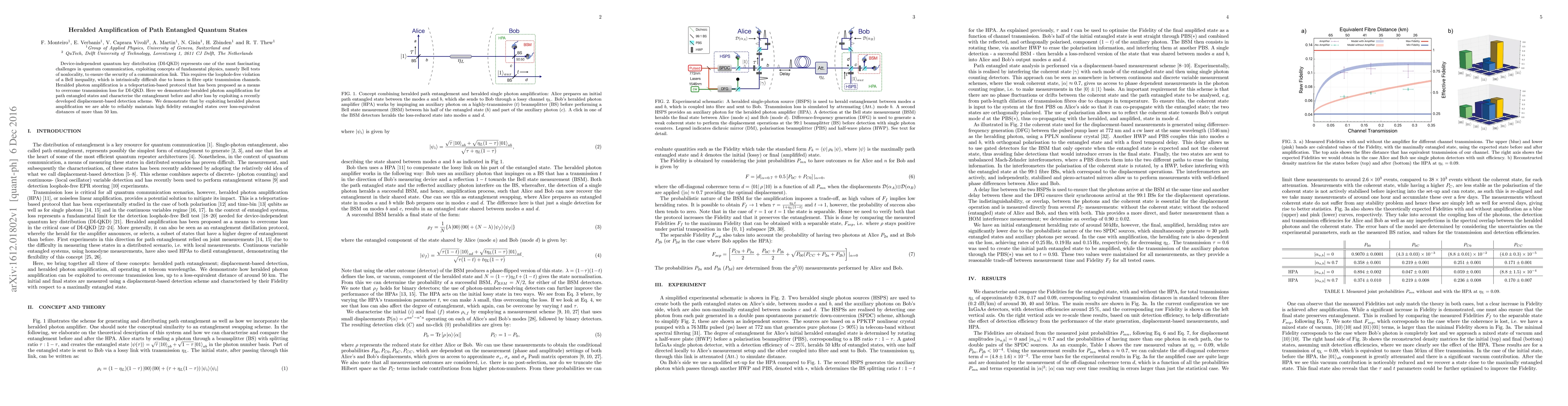 Device-independent quantum key distribution (DI-QKD) represents one of the most fascinating challenges in quantum communication, exploiting concepts of fundamental physics, namely Bell tests of nonlocality, to ensure the security of a communication link. This requires the loophole-free violation of a Bell inequality, which is intrinsically difficult due to losses in fibre optic transmission channels. Heralded photon amplification is a teleportation-based protocol that has been proposed as a means to overcome transmission loss for DI-QKD. Here we demonstrate heralded photon amplification for path entangled states and characterise the entanglement before and after loss by exploiting a recently developed displacement-based detection scheme. We demonstrate that by exploiting heralded photon amplification we are able to reliably maintain high fidelity entangled states over loss-equivalent distances of more than 50~km.