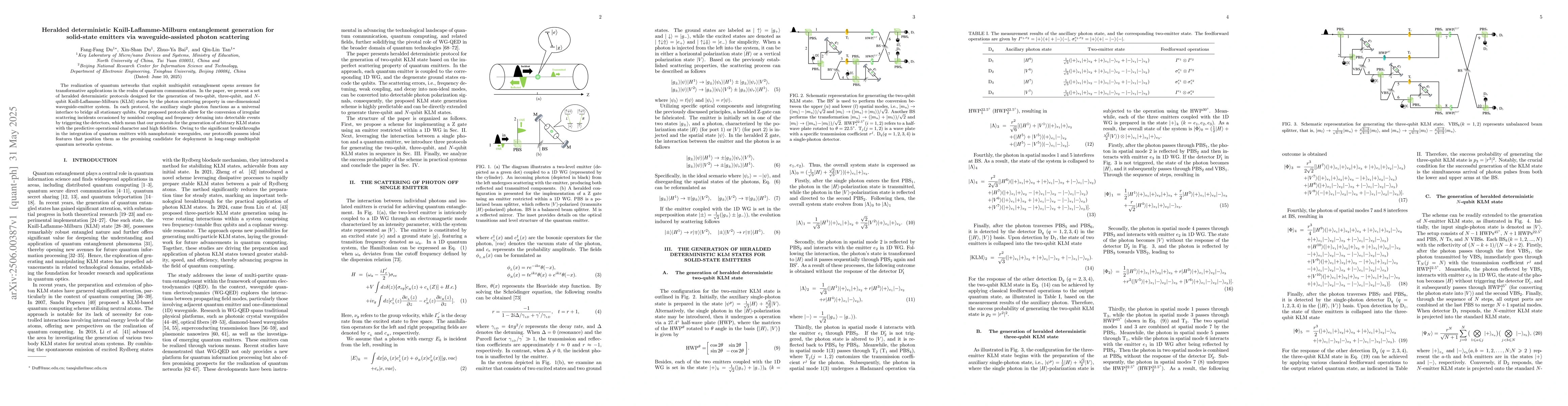Researchers developed deterministic protocols for generating Knill-Laflamme-Milburn entanglement in solid-state emitters using photon scattering in a waveguide-emitter system, enabling long-range quantum networks.