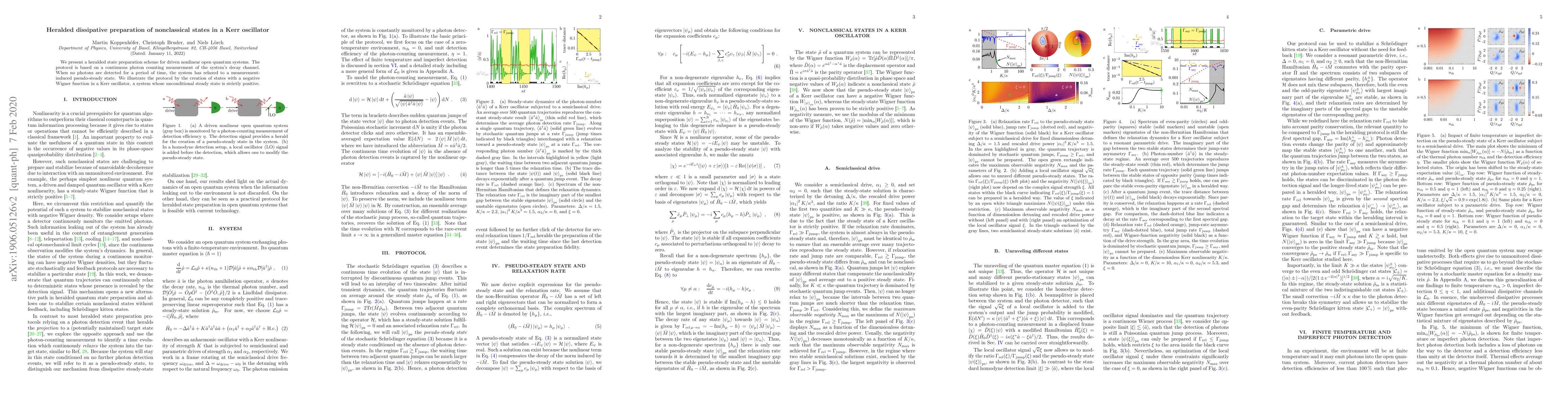 The paper introduces a novel heralded dissipative preparation method for nonclassical states in a Kerr oscillator, utilizing photon counting measurements and demonstrating the creation of states with negative Wigner functions.