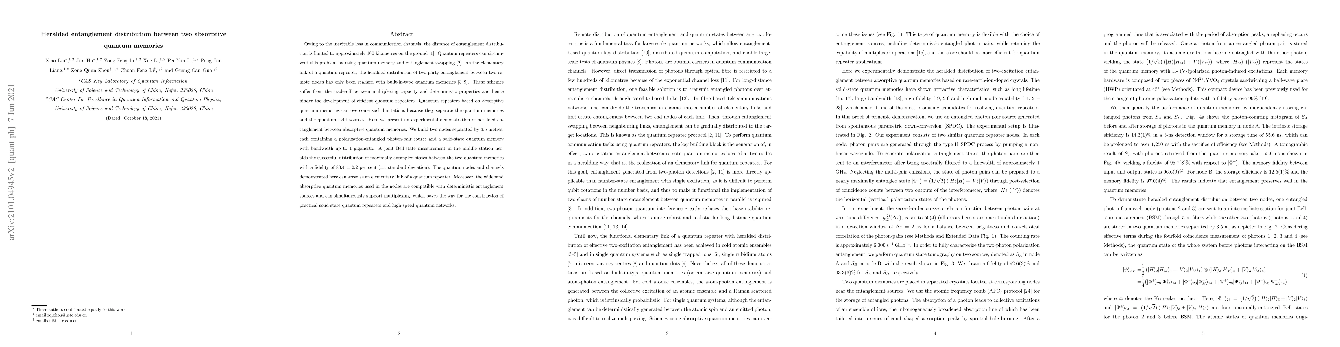 This paper demonstrates the heralded entanglement distribution between two absorptive quantum memories over a distance of 3.5 meters, achieving a fidelity of 80.4 ± 2.2%. The use of absorptive quantum memories allows for practical quantum repeaters and high-speed quantum networks by overcoming limitations of built-in-type quantum memories.