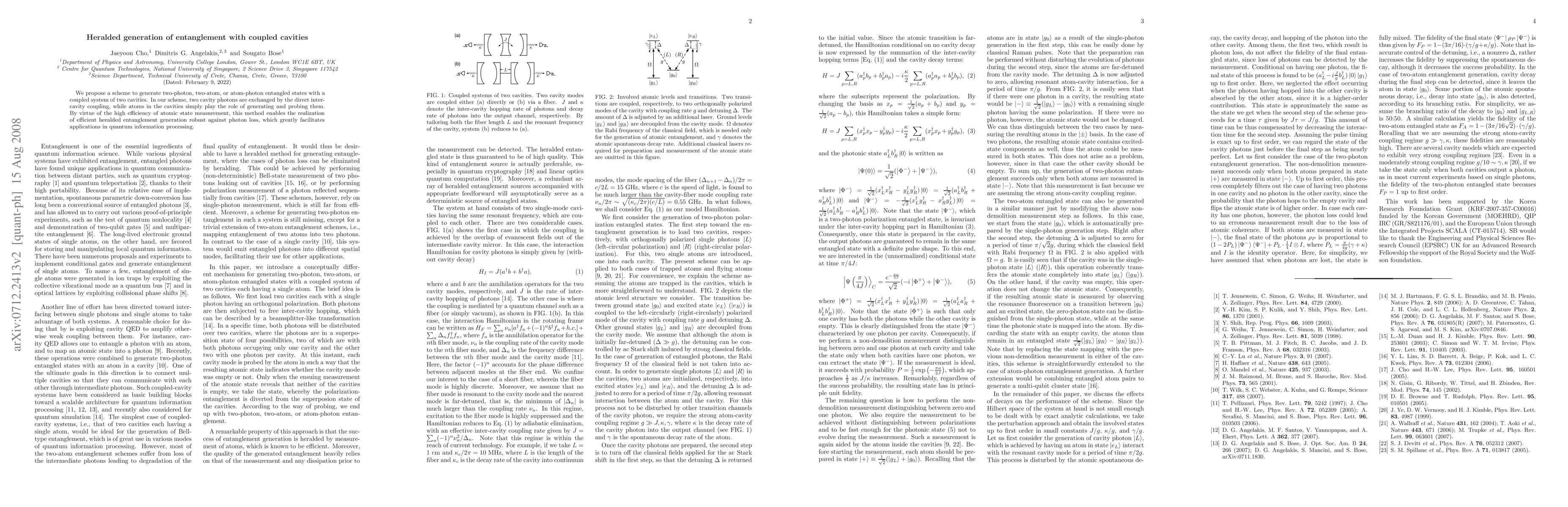 We propose a scheme to generate two-photon, two-atom, or atom-photon entangledstates with a coupled system of two cavities. In our scheme, two cavity photonsare exchanged by the direct inter-cavity coupling, while atoms in the cavitiessimply play the role of generating and probing them. By virtue of the highefficiency of atomic state measurement, this method enables the realization ofefficient heralded entanglement generation robust against photon loss, whichgreatly facilitates applications in quantum information processing.