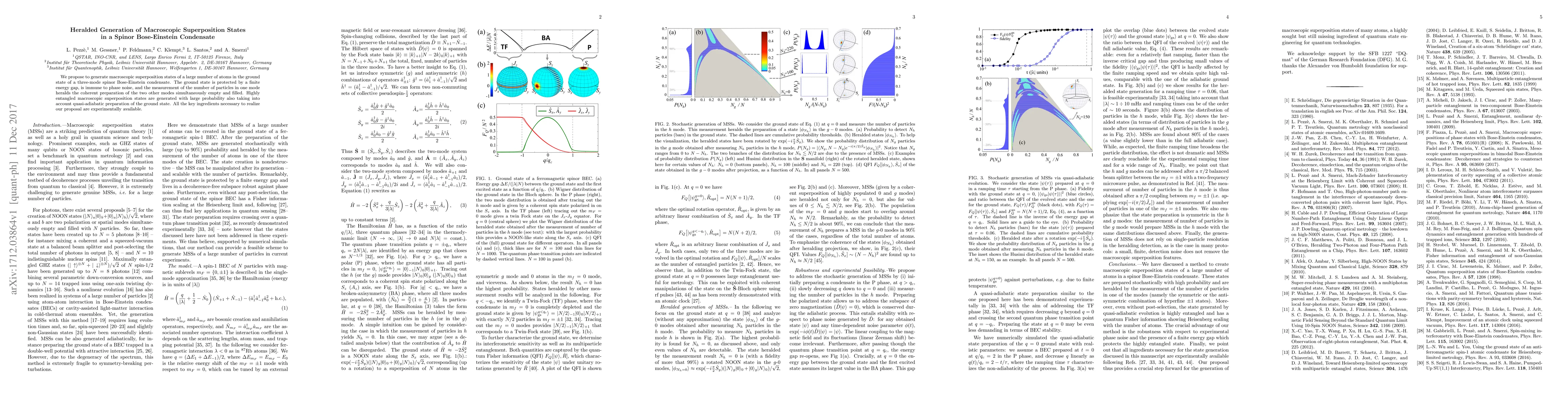 This paper proposes a method to generate macroscopic superposition states in a three-mode spinor Bose-Einstein condensate, leveraging a finite energy gap and particle number measurement to herald the preparation of entangled states. The approach is feasible with current experimental technology.