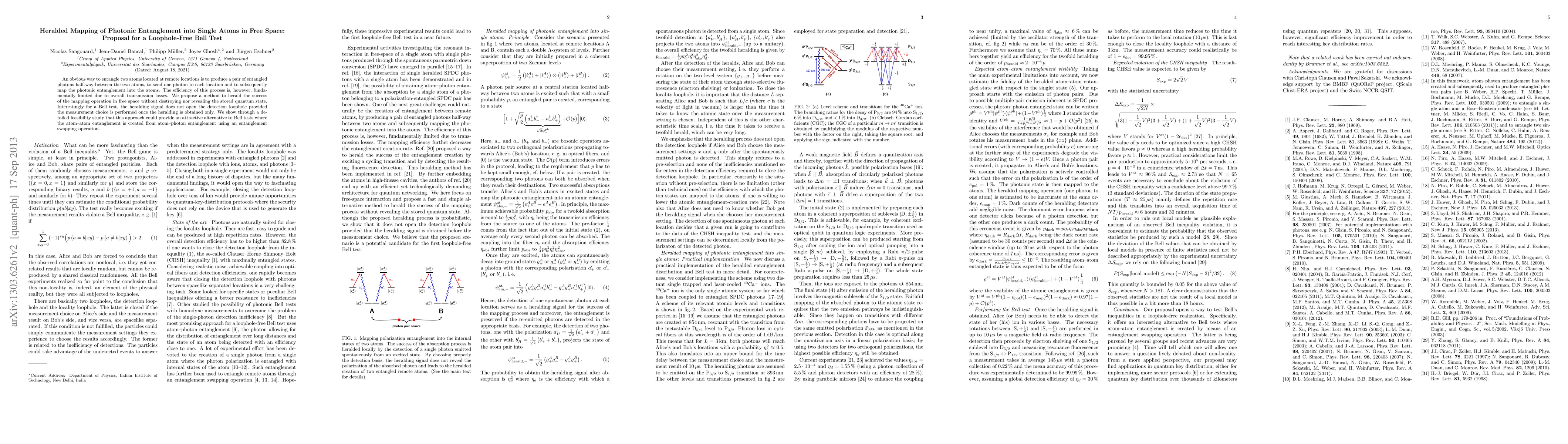 The paper proposes a method to entangle two distant atoms by mapping photonic entanglement into them, using heralded signals to confirm success without compromising the quantum state. This technique aims to offer a loophole-free Bell test by avoiding the detection loophole through strategic measurement timing.