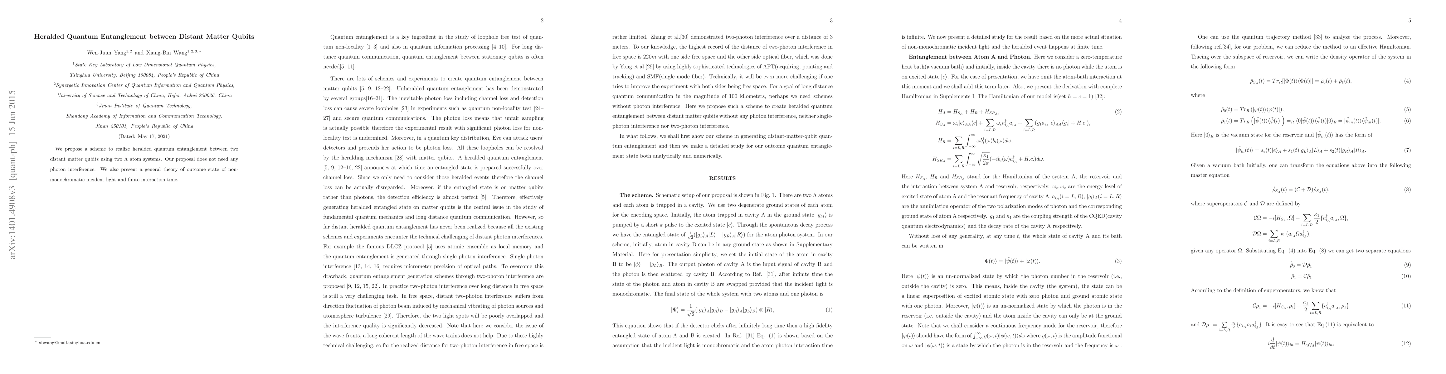 The paper proposes a scheme for heralded quantum entanglement between two distant matter qubits using two $\Lambda$ atom systems without requiring photon interference. It presents a general theory for the outcome state of non-monochromatic incident light and finite interaction time.