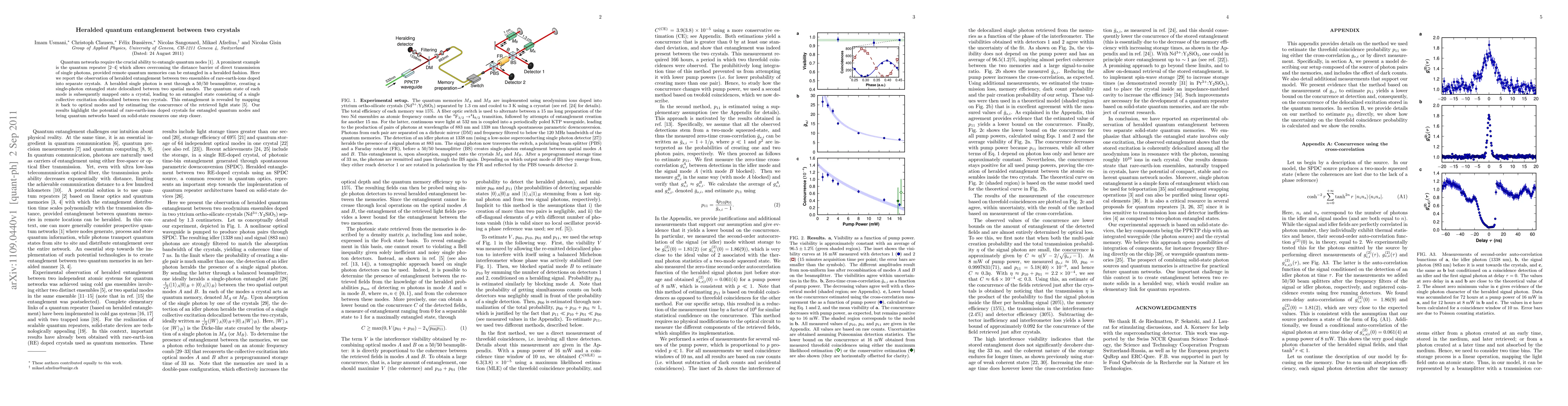 This paper reports the successful demonstration of heralded quantum entanglement between two separate crystals doped with rare-earth ions, achieved by entangling single photons through a beamsplitter and mapping the quantum state onto the crystals. The entanglement is confirmed by measuring the concurrence of the retrieved light state, showcasing the potential of these crystals for quantum networking.