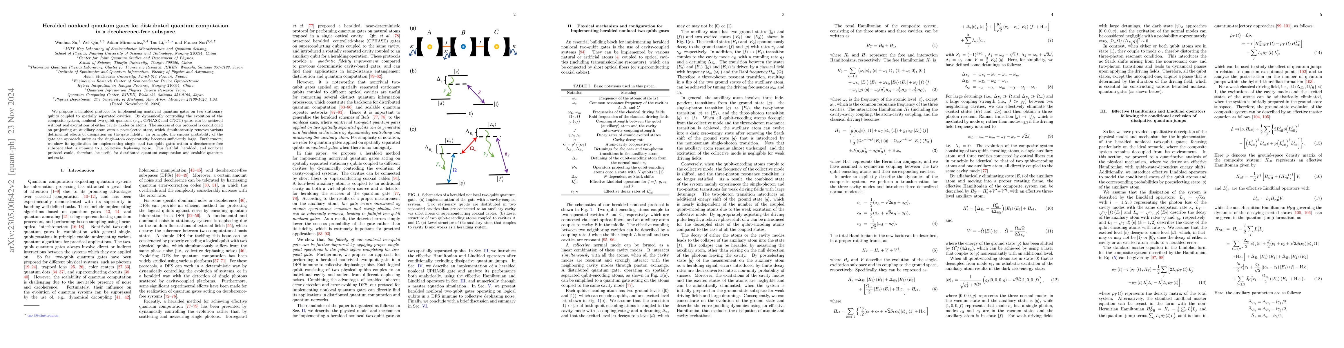 This paper proposes a heralded nonlocal protocol for implementing an entangling gate on stationary qubits in spatially separated cavities, achieving high fidelity without real excitations. The protocol's success hinges on projecting an auxiliary atom onto a postselected state, effectively mitigating decoherence and enabling distributed quantum computation.