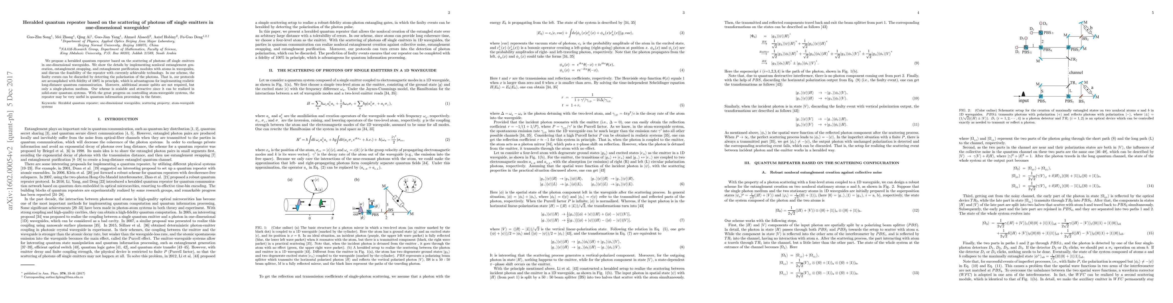 This paper proposes a heralded quantum repeater utilizing photons scattered off single emitters in one-dimensional waveguides, achieving 100% fidelity through polarization detection. The scheme is scalable and feasible with current technology, requiring no additional atomic qubits beyond the single-photon medium.