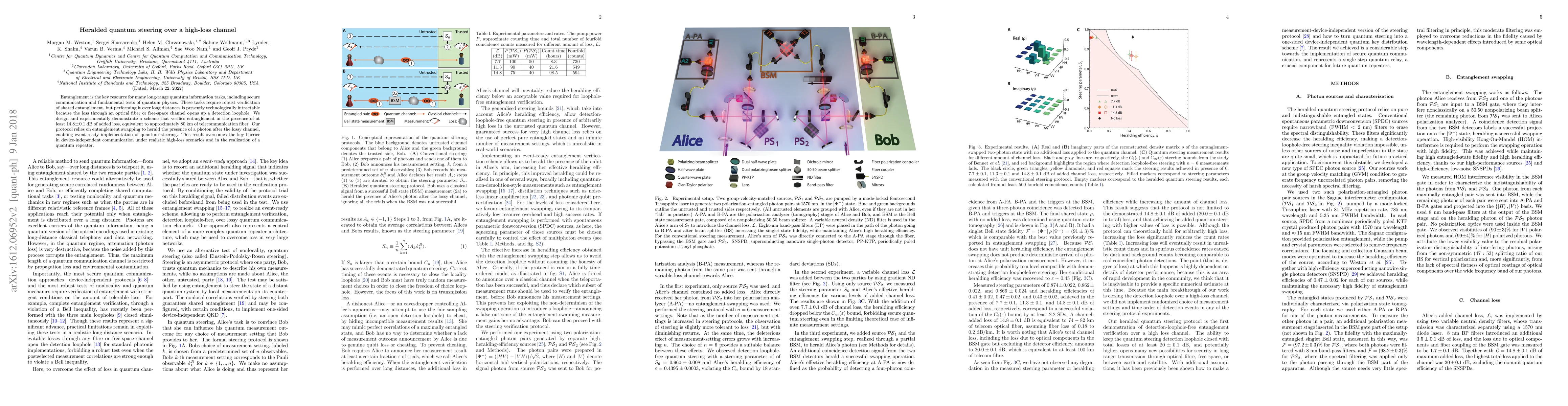 This paper presents a scheme to verify entanglement over high-loss channels using heralded quantum steering, overcoming the detection loophole. The protocol successfully demonstrates entanglement verification through approximately 80 km of fiber, paving the way for device-independent quantum communication.