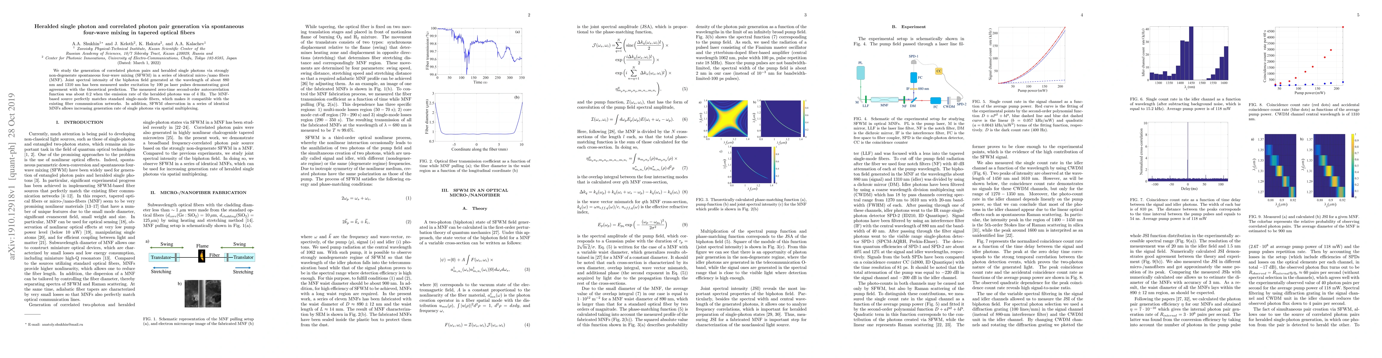 This paper investigates the generation of correlated photon pairs and heralded single photons using non-degenerate spontaneous four-wave mixing in micro-/nano fibers, demonstrating compatibility with existing fiber networks and enhanced single-photon generation via spatial multiplexing. The study shows good theoretical-experimental agreement for photon pair generation at specific wavelengths.