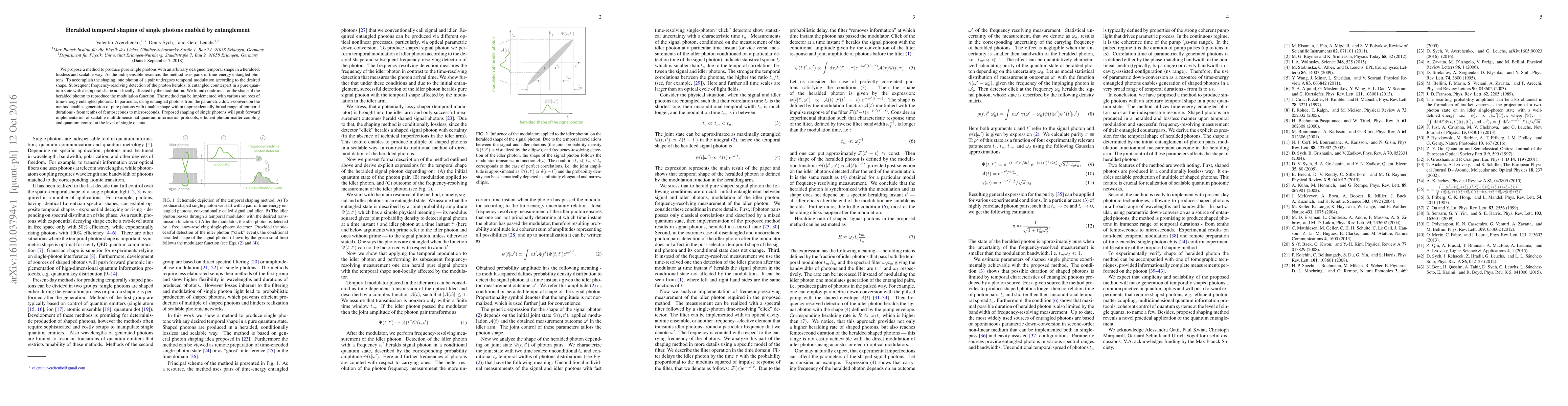 This paper proposes a scalable method for generating pure single photons with arbitrary temporal shapes using time-energy entangled photon pairs, enabling applications in quantum information and quantum control. The method leverages temporal modulation and frequency-resolving detection to achieve lossless heralded shaping over a broad range of durations.
