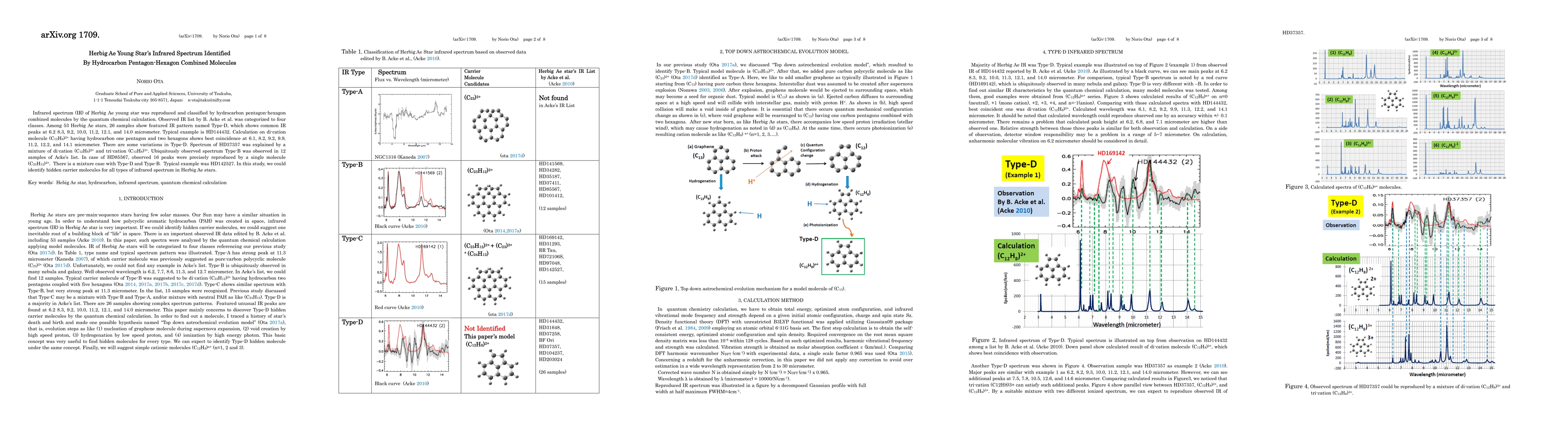 This research identifies the infrared spectrum of Herbig Ae young stars using quantum chemical calculations, attributing the observed IR peaks to hydrocarbon pentagon-hexagon combined molecules. The study categorizes 26 stars into Type-D, characterized by specific IR peaks, with a best match found in the di-cation molecule (C12H8)2+. Other types, like Type-B and mixed types, are also explained by different molecular compositions.