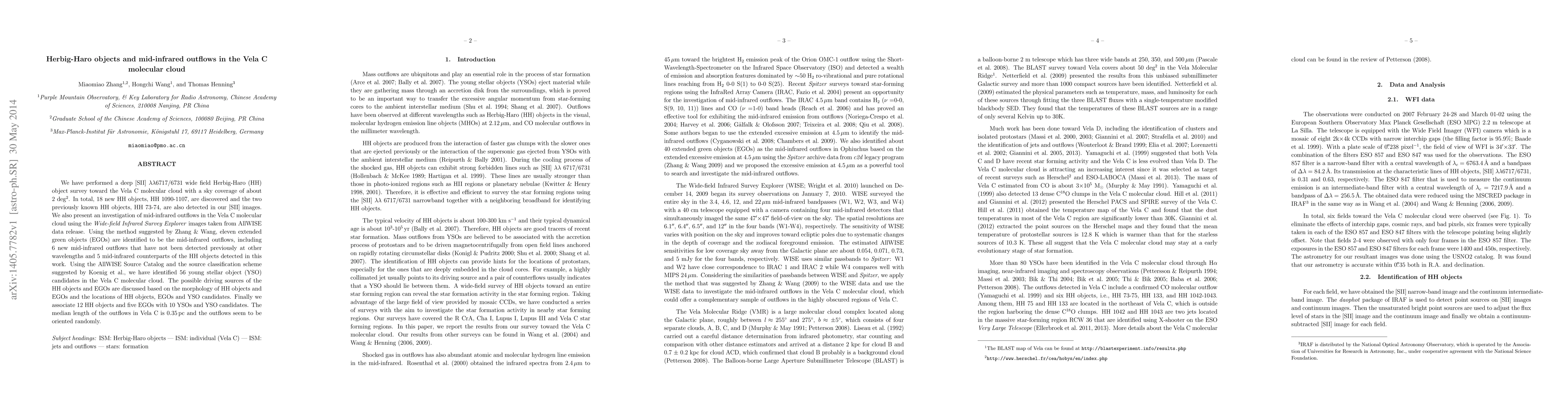 This study discovers 18 new Herbig-Haro (HH) objects and identifies 11 mid-infrared outflows in the Vela C molecular cloud, associating 12 HH objects and five outflows with 10 young stellar objects. The median outflow length is 0.35pc, indicating randomly oriented outflows.