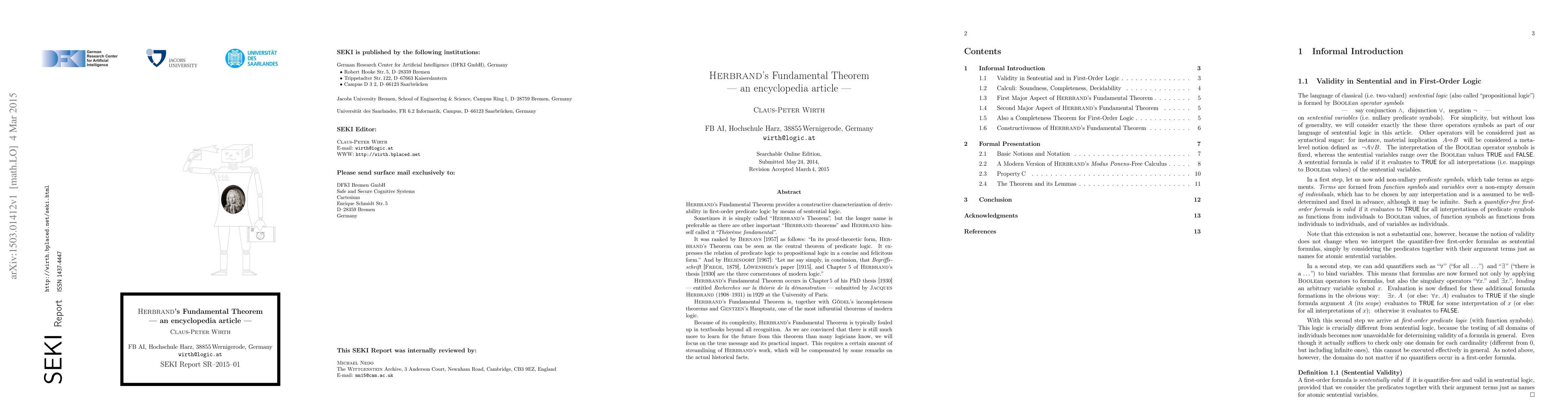 Herbrand's Fundamental Theorem offers a constructive approach to derive conclusions in first-order predicate logic using sentential logic, positioning it as a pivotal theorem in modern logic and a cornerstone alongside Gödel's incompleteness theorems and Gentzen's Hauptsatz. The theorem, presented in Herbrand's 1930 PhD thesis, emphasizes the connection between predicate and propositional logic.