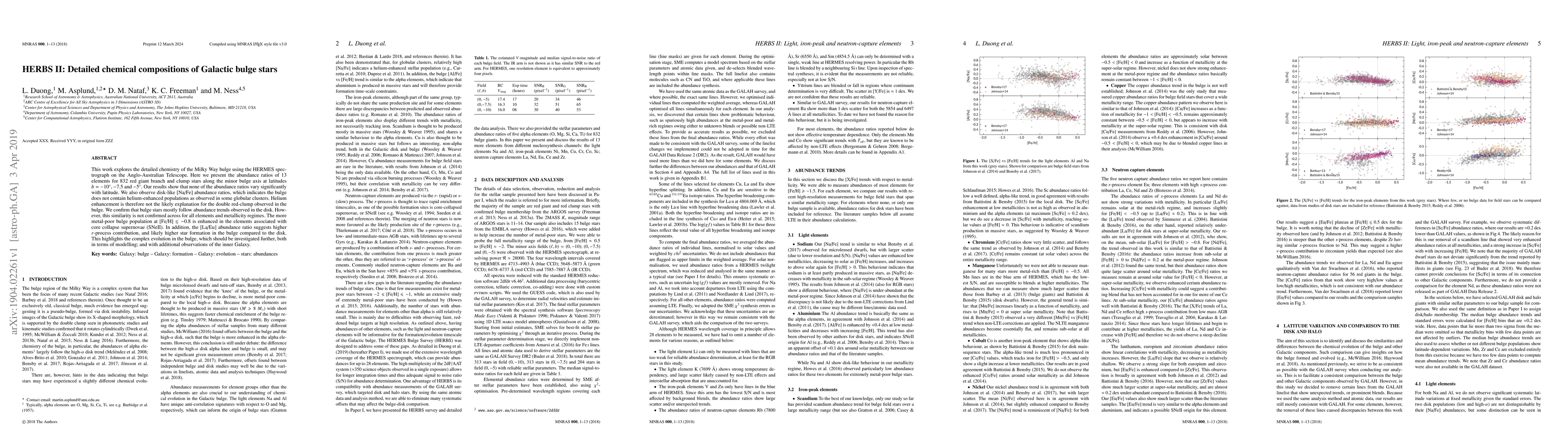This work explores the detailed chemistry of the Milky Way bulge using the HERMES spectrograph on the Anglo-Australian Telescope. Here we present the abundance ratios of 13 elements for 832 red giant branch and clump stars along the minor bulge axis at latitudes $b=-10^{\circ}, -7.5$ and $-5^{\circ}$. Our results show that none of the abundance ratios vary significantly with latitude. We also observe {\color{red}disk-like} [Na/Fe] abundance ratios, which indicates the bulge does not contain helium-enhanced populations as observed in some globular clusters. Helium enhancement is therefore not the likely explanation for the double red-clump observed in the bulge. We confirm that bulge stars mostly follow abundance trends observed in the disk. However, this similarity is not confirmed across for all elements and metallicity regimes. The more metal-poor bulge population at [Fe/H] $\lesssim -0.8$ is enhanced in the elements associated with core collapse supernovae (SNeII). In addition, the [La/Eu] abundance ratio suggests higher $r$-process contribution, and likely higher star formation in the bulge compared to the disk. This highlights the complex evolution in the bulge, which should be investigated further, both in terms of modelling; and with additional observations of the inner Galaxy.