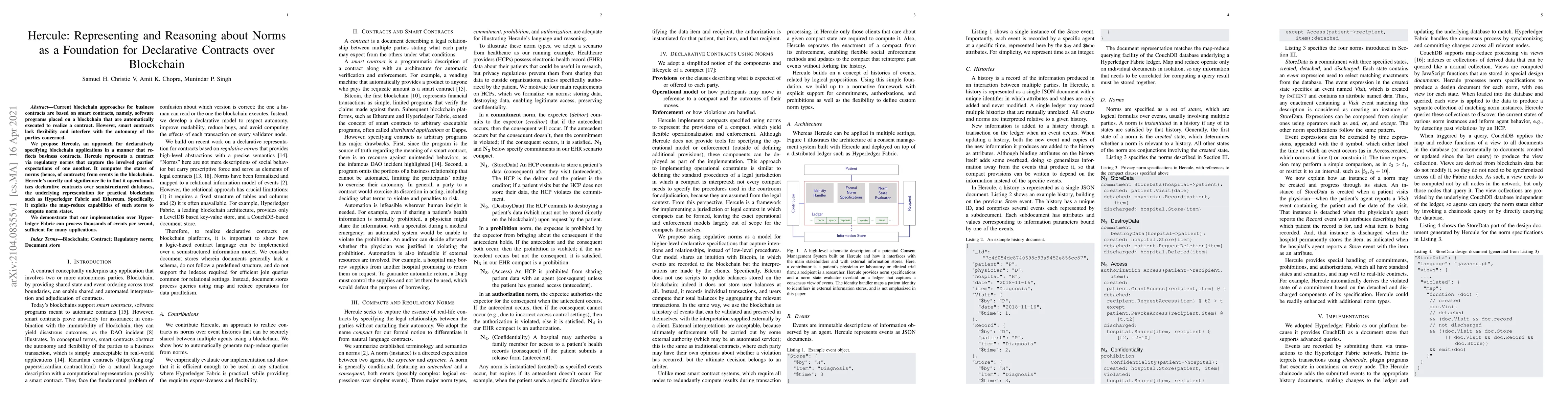 This research paper introduces Hercule, a system that represents and reasons about norms to create flexible blockchain applications that reflect business contracts. It demonstrates high performance processing thousands of events per second over Hyperledger Fabric.