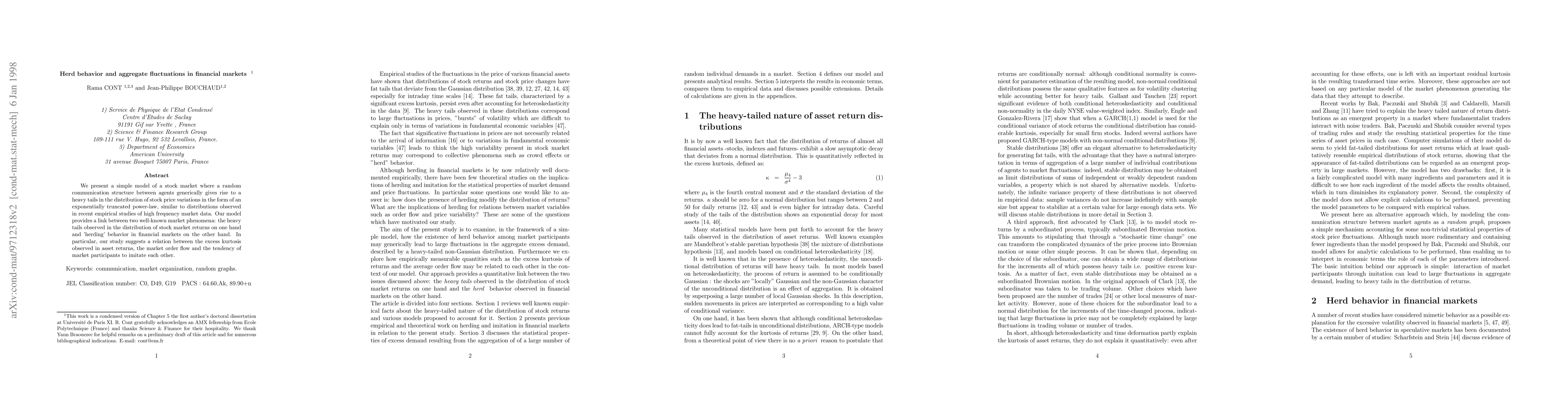 A model shows how random communication between investors can lead to heavy tails in stock market fluctuations and 'herding' behavior, linking it to excess kurtosis and market order flow.
