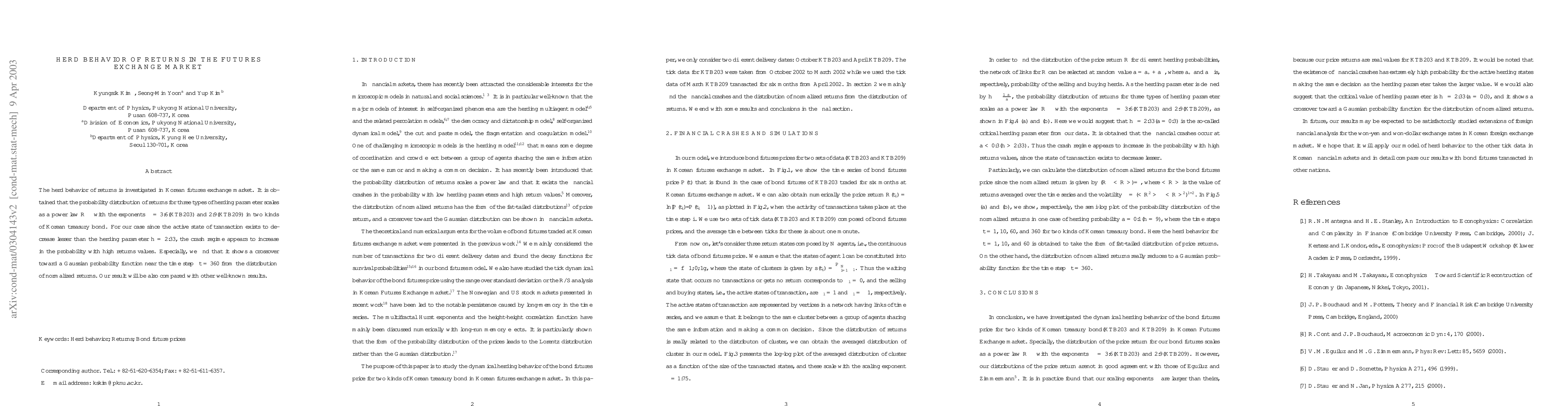The research examines herd behavior in the Korean futures market, finding power-law distributions for return probabilities in two treasury bond types. The herding parameter indicates a crash regime with high returns when below a threshold (h=2.33). Near a specific time step (Δt=360), the return distribution shifts towards a Gaussian function, with results compared to existing studies.