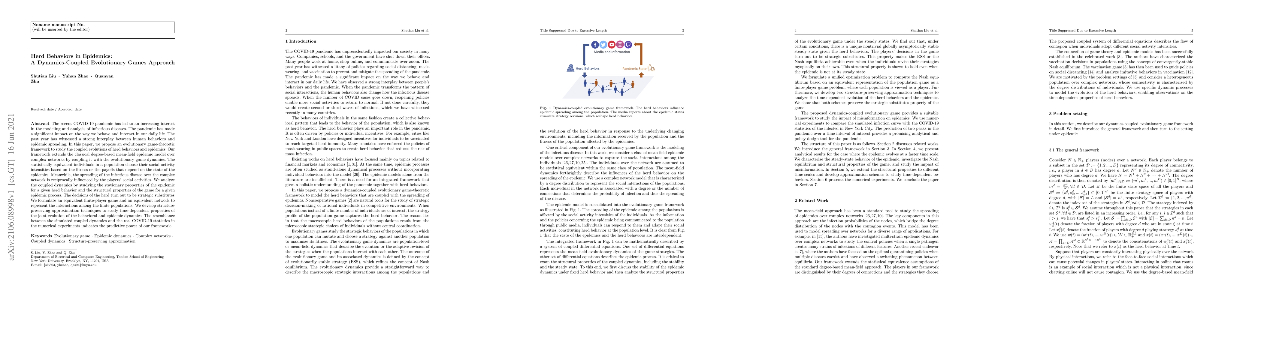 The recent COVID-19 pandemic has led to an increasing interest in the modeling and analysis of infectious diseases. The pandemic has made a significant impact on the way we behave and interact in our daily life. The past year has witnessed a strong interplay between human behaviors and epidemic spreading. In this paper, we propose an evolutionary game-theoretic framework to study the coupled evolutions of herd behaviors and epidemics. Our framework extends the classical degree-based mean-field epidemic model over complex networks by coupling it with the evolutionary game dynamics. The statistically equivalent individuals in a population choose their social activity intensities based on the fitness or the payoffs that depend on the state of the epidemics. Meanwhile, the spreading of the infectious disease over the complex network is reciprocally influenced by the players' social activities. We analyze the coupled dynamics by studying the stationary properties of the epidemic for a given herd behavior and the structural properties of the game for a given epidemic process. The decisions of the herd turn out to be strategic substitutes. We formulate an equivalent finite-player game and an equivalent network to represent the interactions among the finite populations. We develop structure-preserving approximation techniques to study time-dependent properties of the joint evolution of the behavioral and epidemic dynamics. The resemblance between the simulated coupled dynamics and the real COVID-19 statistics in the numerical experiments indicates the predictive power of our framework.