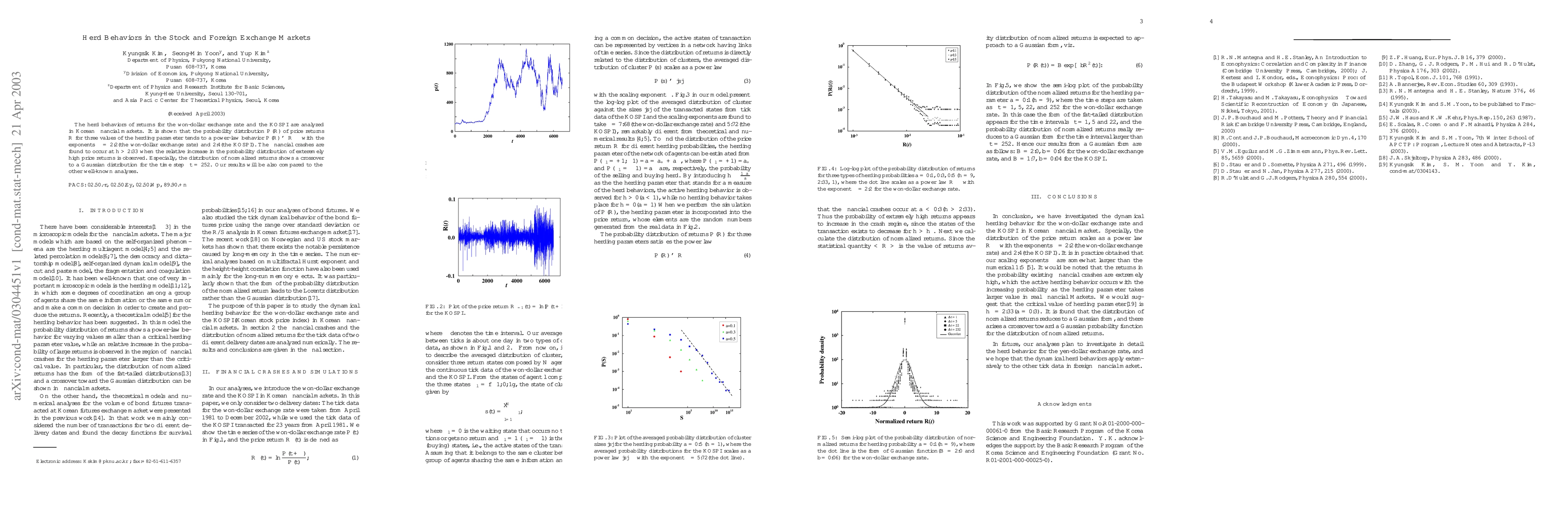 Research shows that price returns in Korean financial markets exhibit power-law behavior, with extreme crashes occurring at specific herd behavior thresholds, similar to other well-known analyses.