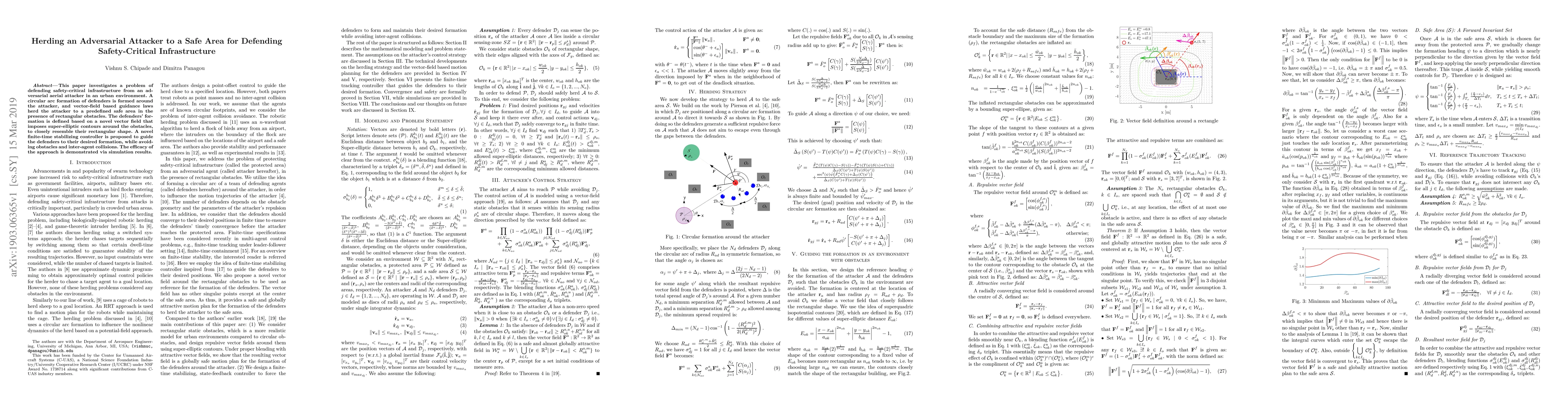 This paper investigates a problem of defending safety-critical infrastructure from an adversarial aerial attacker in an urban environment. A circular arc formation of defenders is formed around the attacker, and vector-field based guidance laws herd the attacker to a predefined safe area in the presence of rectangular obstacles. The defenders' formation is defined based on a novel vector field that imposes super-elliptic contours around the obstacles, to closely resemble their rectangular shape. A novel finite-time stabilizing controller is proposed to guide the defenders to their desired formation while avoiding obstacles and inter-agent collisions. The efficiency of the approach is demonstrated via simulation results.