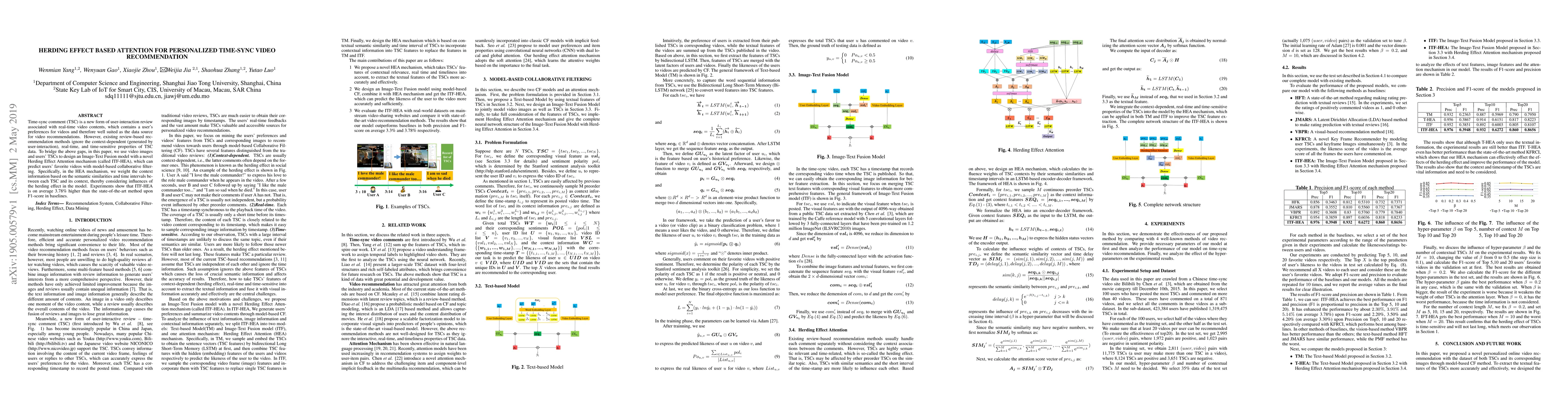 Time-sync comment (TSC) is a new form of user-interaction review associated with real-time video contents, which contains a user's preferences for videos and therefore well suited as the data source for video recommendations. However, existing review-based recommendation methods ignore the context-dependent (generated by user-interaction), real-time, and time-sensitive properties of TSC data. To bridge the above gaps, in this paper, we use video images and users' TSCs to design an Image-Text Fusion model with a novel Herding Effect Attention mechanism (called ITF-HEA), which can predict users' favorite videos with model-based collaborative filtering. Specifically, in the HEA mechanism, we weight the context information based on the semantic similarities and time intervals between each TSC and its context, thereby considering influences of the herding effect in the model. Experiments show that ITF-HEA is on average 3.78\% higher than the state-of-the-art method upon F1-score in baselines.
