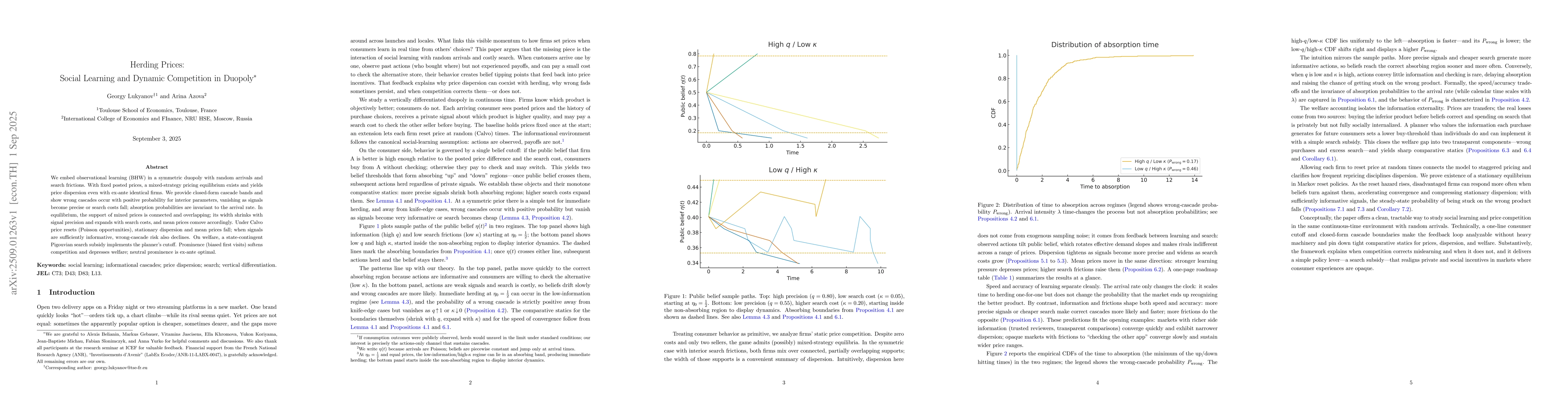 We embed observational learning (BHW) in a symmetric duopoly with random arrivals and search frictions. With fixed posted prices, a mixed-strategy pricing equilibrium exists and yields price dispersion even with ex-ante identical firms. We provide closed-form cascade bands and show wrong cascades occur with positive probability for interior parameters, vanishing as signals become precise or search costs fall; absorption probabilities are invariant to the arrival rate. In equilibrium, the support of mixed prices is connected and overlapping; its width shrinks with signal precision and expands with search costs, and mean prices comove accordingly. Under Calvo price resets (Poisson opportunities), stationary dispersion and mean prices fall; when signals are sufficiently informative, wrong-cascade risk also declines. On welfare, a state-contingent Pigouvian search subsidy implements the planner's cutoff. Prominence (biased first visits) softens competition and depresses welfare; neutral prominence is ex-ante optimal.