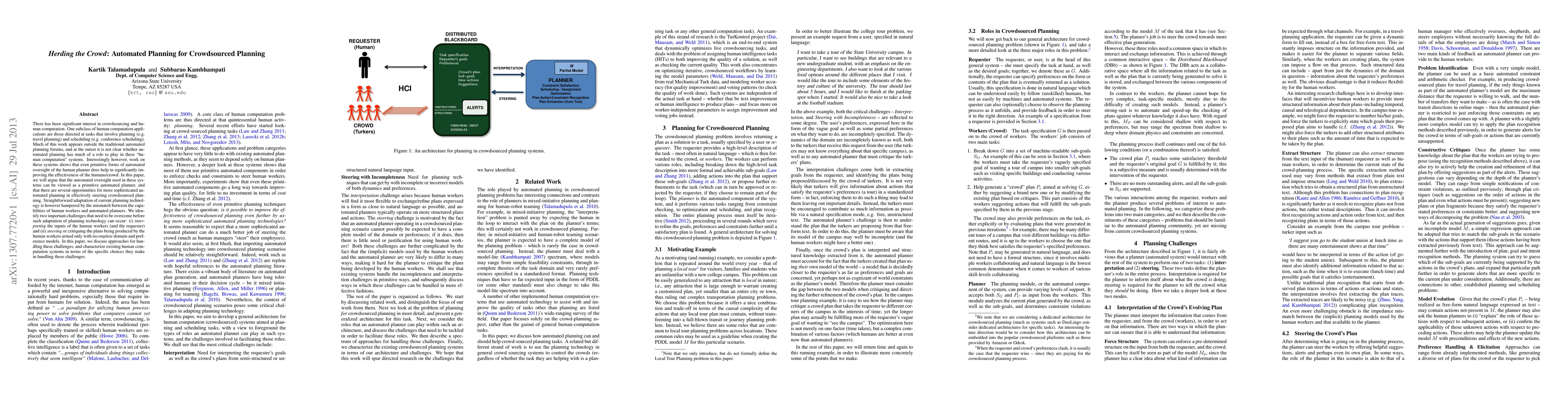 There has been significant interest in crowdsourcing and human computation. One subclass of human computation applications are those directed at tasks that involve planning (e.g. travel planning) and scheduling (e.g. conference scheduling). Much of this work appears outside the traditional automated planning forums, and at the outset it is not clear whether automated planning has much of a role to play in these human computation systems. Interestingly however, work on these systems shows that even primitive forms of automated oversight of the human planner does help in significantly improving the effectiveness of the humans/crowd. In this paper, we will argue that the automated oversight used in these systems can be viewed as a primitive automated planner, and that there are several opportunities for more sophisticated automated planning in effectively steering crowdsourced planning. Straightforward adaptation of current planning technology is however hampered by the mismatch between the capabilities of human workers and automated planners. We identify two important challenges that need to be overcome before such adaptation of planning technology can occur: (i) interpreting the inputs of the human workers (and the requester) and (ii) steering or critiquing the plans being produced by the human workers armed only with incomplete domain and preference models. In this paper, we discuss approaches for handling these challenges, and characterize existing human computation systems in terms of the specific choices they make in handling these challenges.