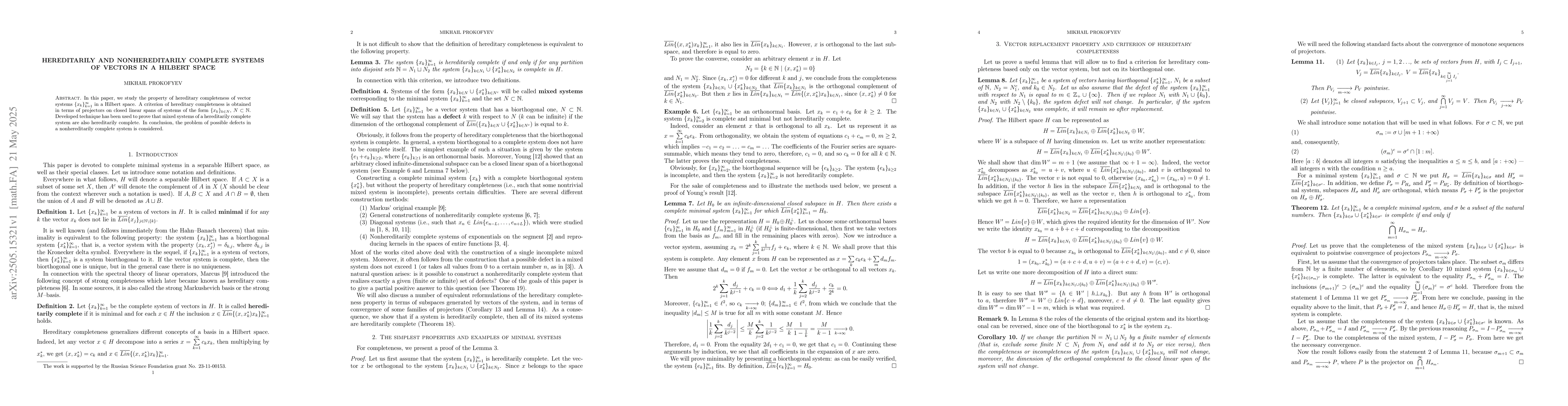 The paper employs the development of a criterion for hereditary completeness of vector systems in a Hilbert space using projectors on closed linear spans of systems of the form {x_k}_{k ∈ N}, N ⊂ ℕ.