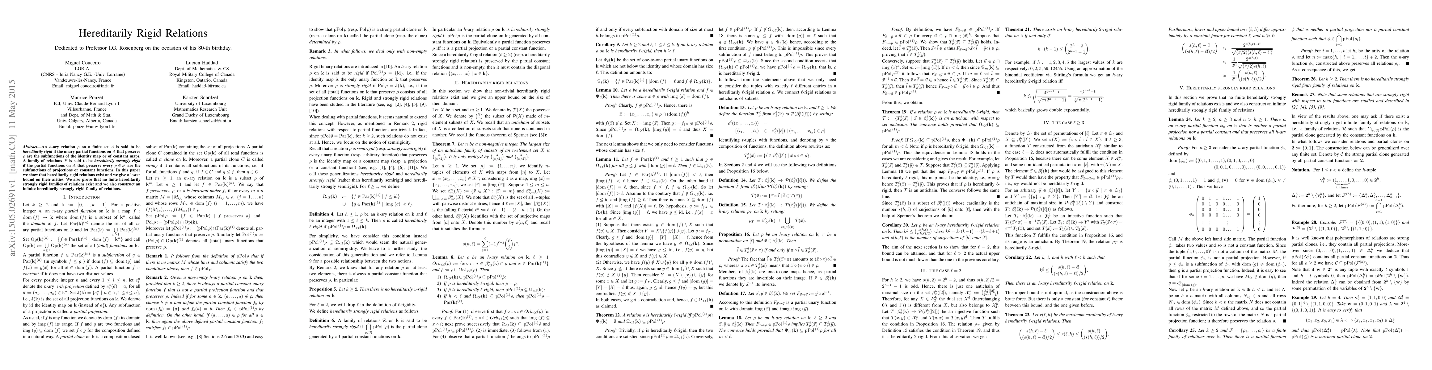 An $h$-ary relation $\r$ on a finite set $A$ is said to be \emph{hereditarily rigid} if the unary partial functions on $A$ that preserve $\r$ are the subfunctions of the identity map or of constant maps. A family of relations ${\mathcal F}$ is said to be \emph{hereditarily strongly rigid} if the partial functions on $A$ that preserve every $\r \in {\mathcal F}$ are the subfunctions of projections or constant functions. In this paper we show that hereditarily rigid relations exist and we give a lower bound on their arities. We also prove that no finite hereditarily strongly rigid families of relations exist and we also construct an infinite hereditarily strongly rigid family of relations.