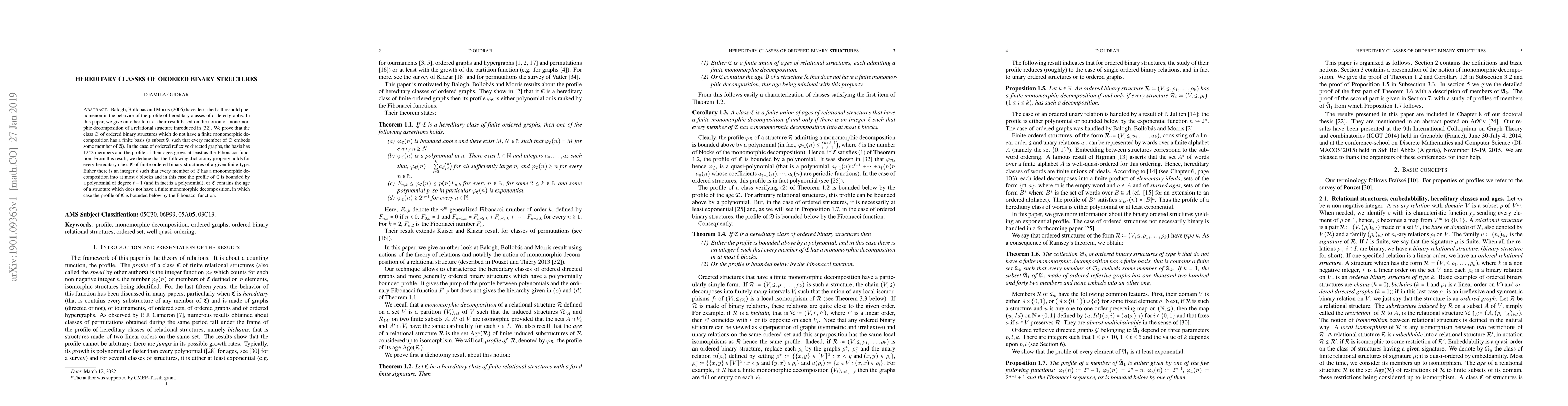 Balogh, Bollob\'{a}s and Morris (2006) have described a threshold phenomenon in the behavior of the profile of hereditary classes of ordered graphs. In this paper, we give an other look at their result based on the notion of monomorphic decomposition of a relational structure introduced in \cite{P-T-2013}. We prove that the class $\mathfrak S$ of ordered binary structures which do not have a finite monomorphic decomposition has a finite basis (a subset $\mathfrak A$ such that every member of $\mathfrak S$ embeds some member of $\mathfrak A$). In the case of ordered reflexive directed graphs, the basis has 1242 members and the profile of their ages grows at least as the Fibonacci function. From this result, we deduce that the following dichotomy property holds for every hereditary class $\mathfrak C$ of finite ordered binary structures of a given finite type. Either there is an integer $\ell$ such that every member of $\mathfrak C$ has a monomorphic decomposition into at most $\ell$ blocks and in this case the profile of $\mathfrak C$ is bounded by a polynomial of degree $\ell-1$ (and in fact is a polynomial), or $\mathfrak C$ contains the age of a structure which does not have a finite monomorphic decomposition, in which case the profile of $\mathfrak C$ is bounded below by the Fibonacci function.