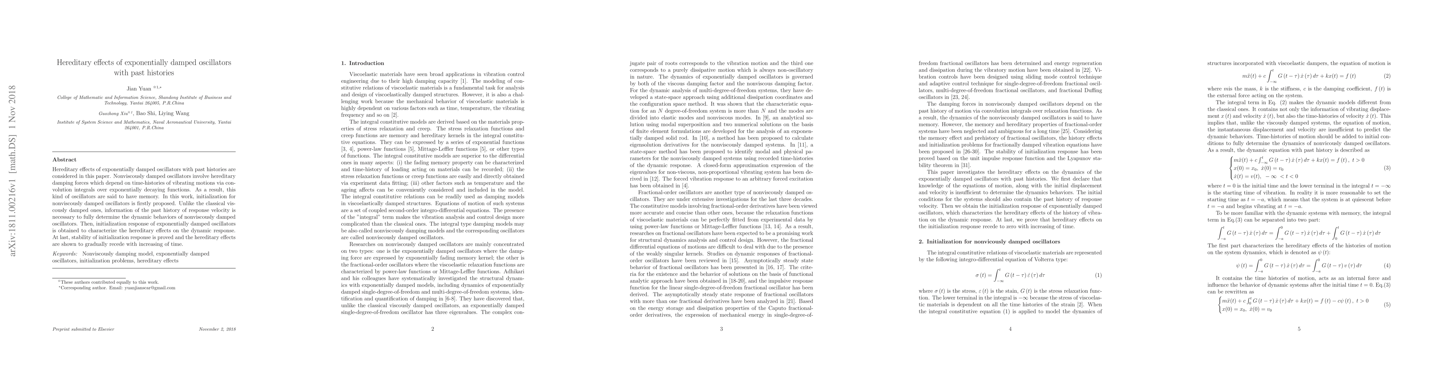 Hereditary effects of exponentially damped oscillators with past histories are considered in this paper. Nonviscously damped oscillators involve hereditary damping forces which depend on time-histories of vibrating motions via convolution integrals over exponentially decaying functions. As a result, this kind of oscillators are said to have memory. In this work, initialization for nonviscously damped oscillators is firstly proposed. Unlike the classical viscously damped ones, information of the past history of response velocity is necessary to fully determine the dynamic behaviors of nonviscously damped oscillators. Then, initialization response of exponentially damped oscillators is obtained to characterize the hereditary effects on the dynamic response. At last, stability of initialization response is proved and the hereditary effects are shown to gradually recede with increasing of time.