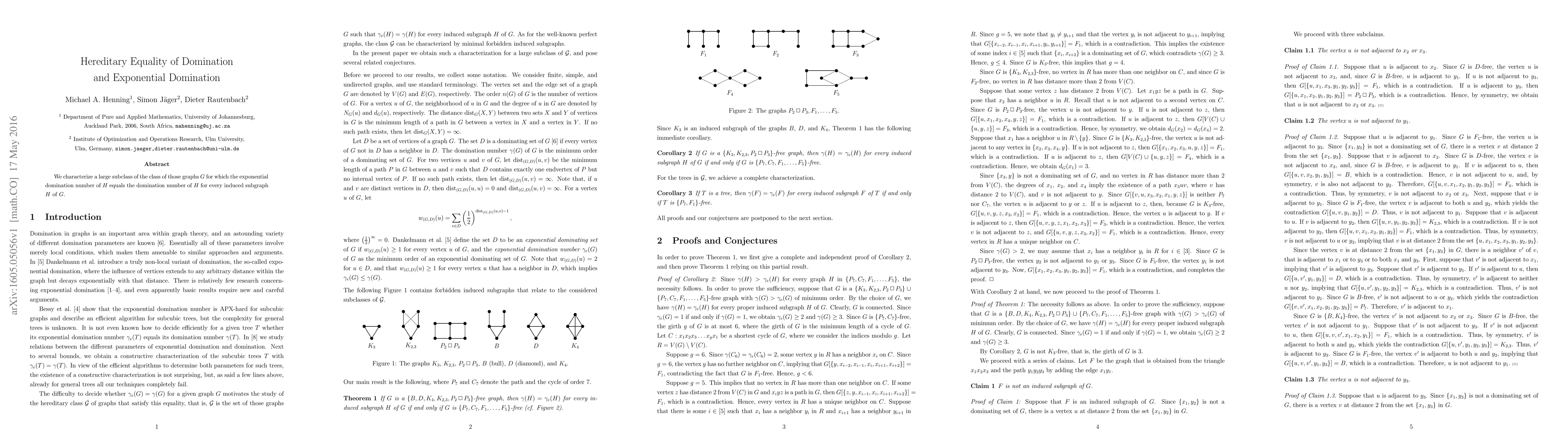 This paper identifies a significant subset of graphs where the exponential domination number matches the domination number for every induced subgraph, establishing hereditary equality of these two graph theoretical measures.