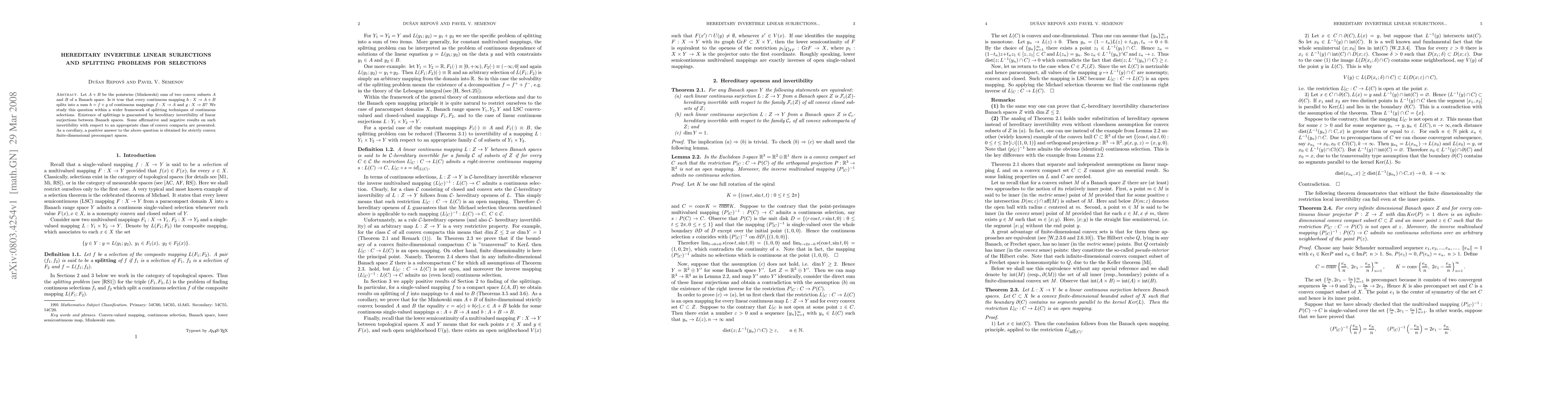 Let $A+B$ be the pointwise (Minkowski) sum of two convex subsets $A$ and $B$ of a Banach space. Is it true that every continuous mapping $h:X \to A+B$ splits into a sum $h=f+g$ of continuous mappings $f:X \to A$ and $g:X \to B$? We study this question within a wider framework of splitting techniques of continuous selections. Existence of splittings is guaranteed by hereditary invertibility of linear surjections between Banach spaces. Some affirmative and negative results on such invertibility with respect to an appropriate class of convex compacta are presented. As a corollary, a positive answer to the above question is obtained for strictly convex finite-dimensional precompact spaces.