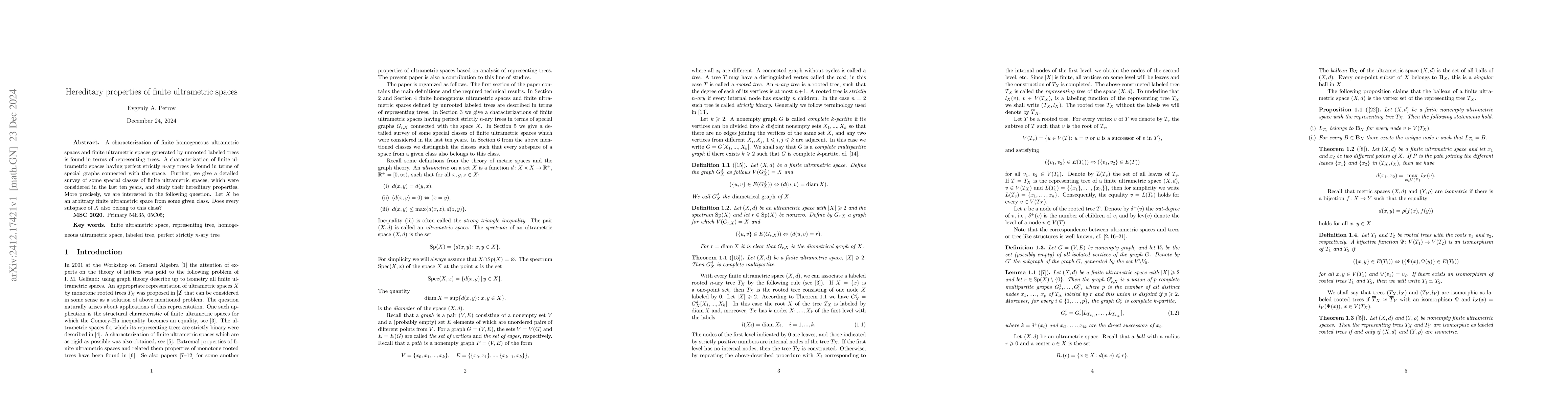 A characterization of finite homogeneous ultrametric spaces and finite ultrametric spaces generated by unrooted labeled trees is found in terms of representing trees. A characterization of finite ultrametric spaces having perfect strictly $n$-ary trees is found in terms of special graphs connected with the space. Further, we give a detailed survey of some special classes of finite ultrametric spaces, which were considered in the last ten years, and study their hereditary properties. More precisely, we are interested in the following question. Let $X$ be an arbitrary finite ultrametric space from some given class. Does every subspace of $X$ also belong to this class?