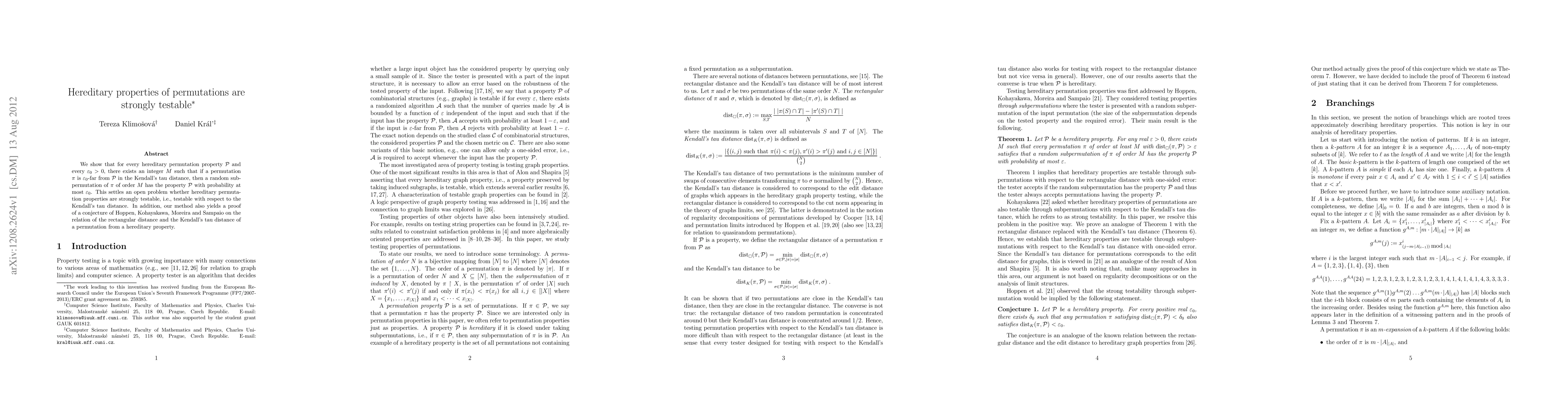 We show that for every hereditary permutation property P and every eps>0, there exists an integer M such that if a permutation p is eps-far from P in the Kendall's tau distance, then a random subpermutation of p of order M has the property P with probability at most eps. This settles an open problem whether hereditary permutation properties are strongly testable, i.e., testable with respect to the Kendall's tau distance. In addition, our method also yields a proof of a conjecture of Hoppen, Kohayakawa, Moreira and Sampaio on the relation of the rectangular distance and the Kendall's tau distance of a permutation from a hereditary property.