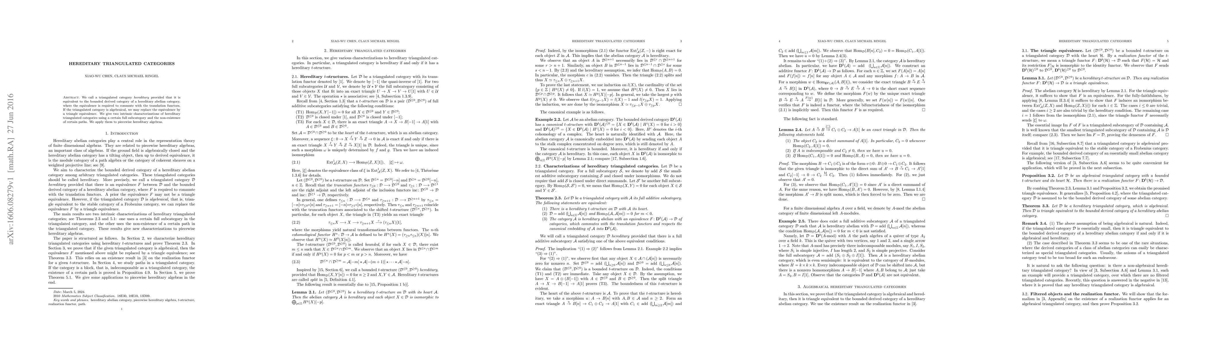 This paper defines hereditary triangulated categories as those equivalent to the bounded derived category of a hereditary abelian category, with a focus on algebraic hereditary triangulated categories. It provides two intrinsic characterizations and applies these to piecewise hereditary algebras.