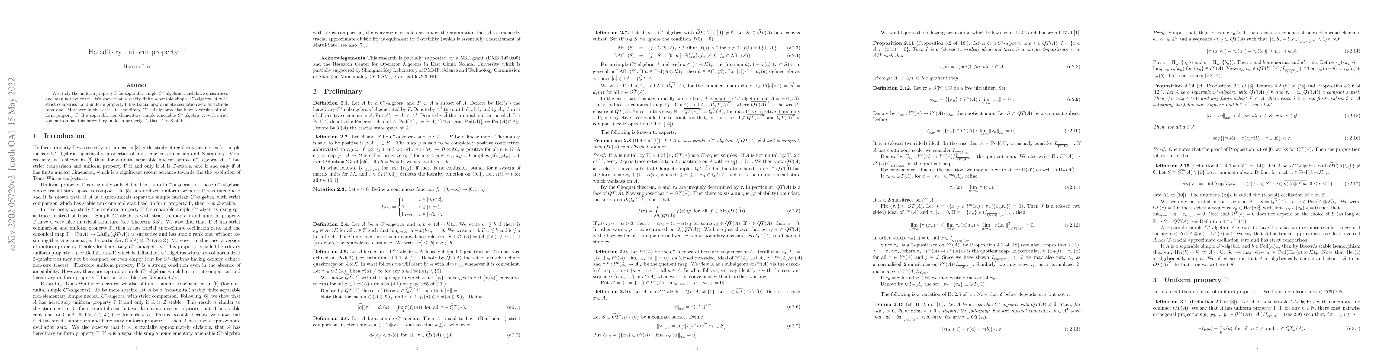 This paper investigates the hereditary uniform property $\Gamma$ in separable simple $C^*$-algebras with quasitraces, showing that such algebras with strict comparison and uniform property $\Gamma$ exhibit tracial approximate oscillation zero and stable rank one. It also proves that if a separable non-elementary simple amenable $C^*$-algebra with strict comparison possesses this hereditary uniform property $\Gamma$, then it is ${\cal Z}$-stable.