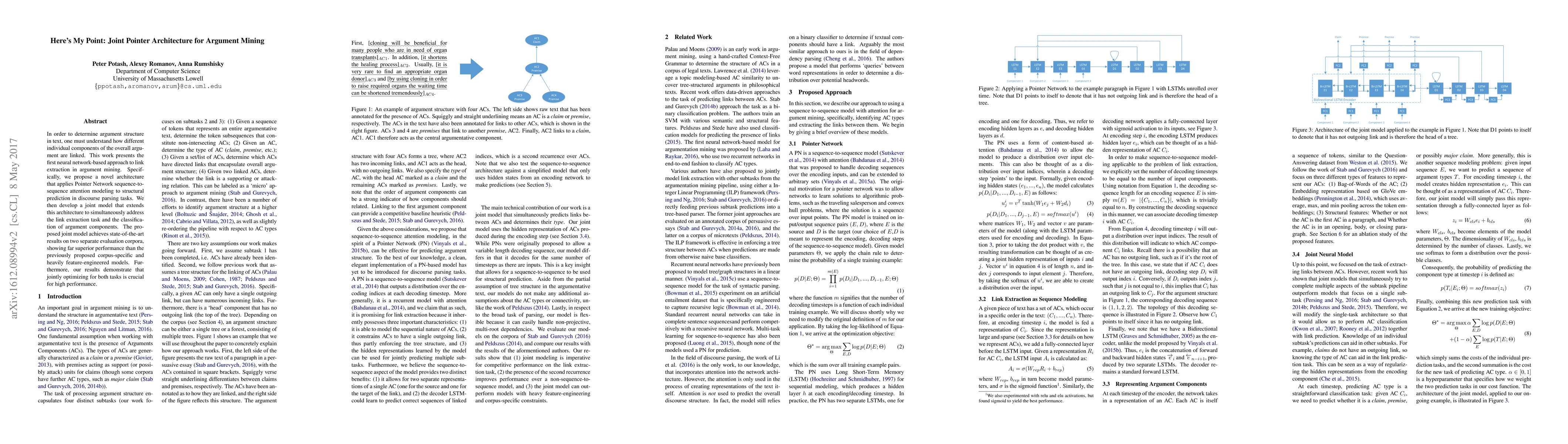 This paper introduces a joint pointer architecture for argument mining, focusing on extracting links between argument components and classifying their types. The proposed model, based on a Pointer Network, achieves state-of-the-art results by optimizing for both tasks simultaneously and incorporating a fully-connected layer before the recurrent neural network input.
