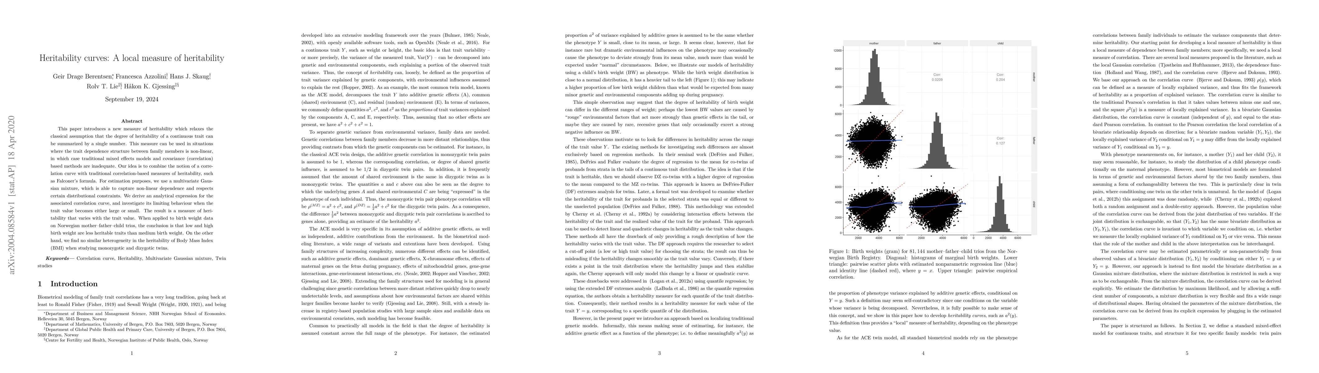 This paper introduces a new measure of heritability which relaxes the classical assumption that the degree of heritability of a continuous trait can be summarized by a single number.This measure can be used in situations where the trait dependence structure between family members is nonlinear, in which case traditional mixed effects models and covariance (correlation) based methods are inadequate. Our idea is to combine the notion of a correlation curve with traditional correlation based measures of heritability, such as the formula of Falconer. For estimation purposes, we use a multivariate Gaussian mixture, which is able to capture non-linear dependence and respects certain distributional constraints. We derive an analytical expression for the associated correlation curve, and investigate its limiting behaviour when the trait value becomes either large or small. The result is a measure of heritability that varies with the trait value. When applied to birth weight data on Norwegian mother father child trios, the conclusion is that low and high birth weight are less heritable traits than medium birth weight. On the other hand, we find no similar heterogeneity in the heritability of Body Mass Index (BMI) when studying monozygotic and dizygotic twins.