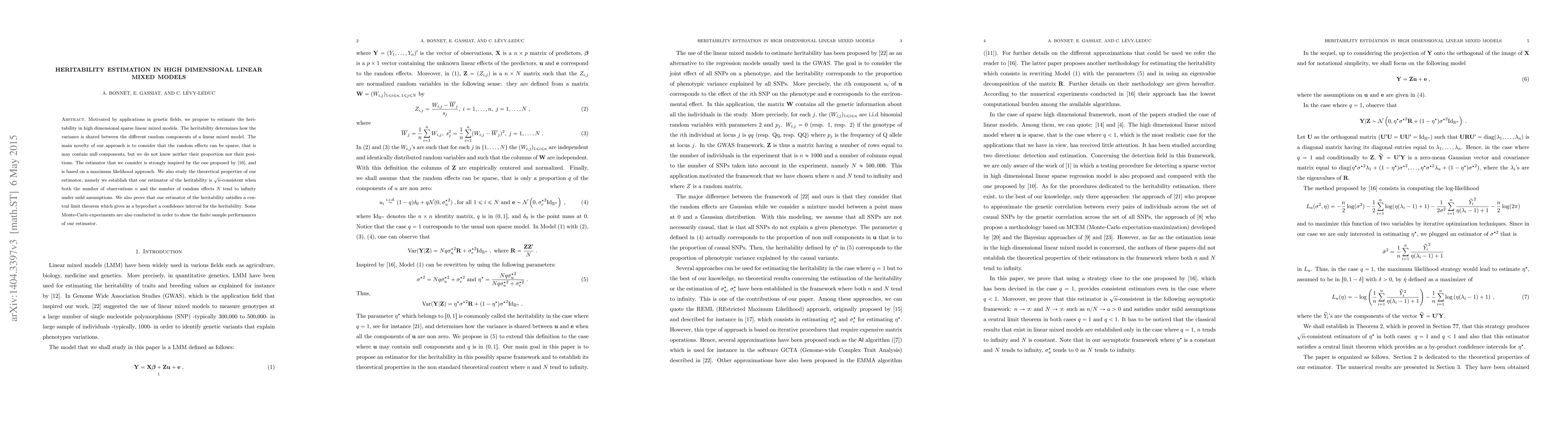 This paper proposes a novel estimator for heritability in high-dimensional sparse linear mixed models, leveraging a maximum likelihood approach. The estimator is shown to be $\sqrt{n}$-consistent and satisfies a central limit theorem, providing a confidence interval for heritability, with Monte-Carlo experiments validating its finite sample performance.