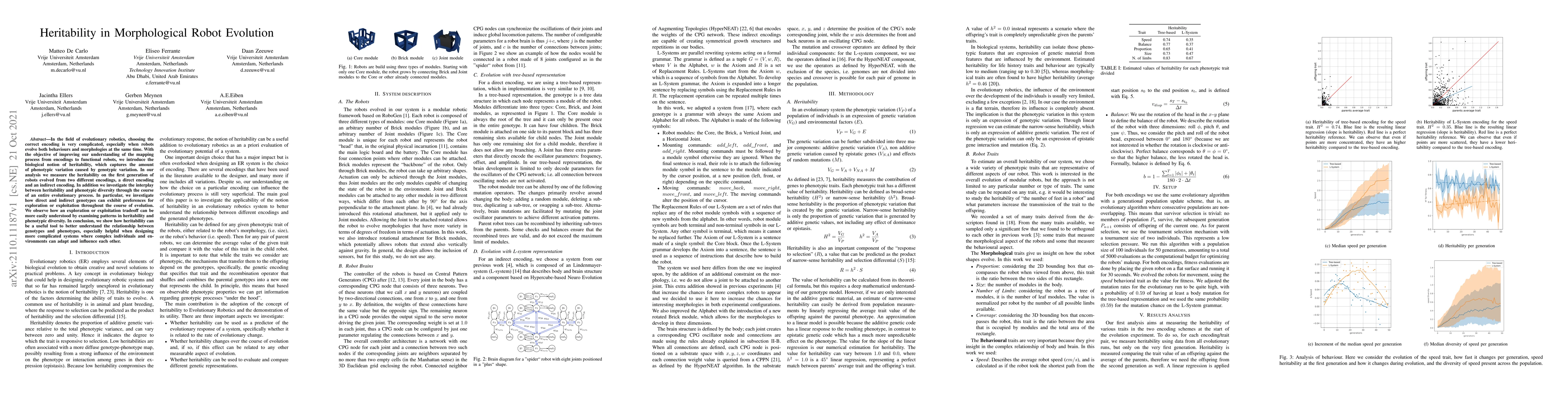 In the field of evolutionary robotics, choosing the correct encoding is very complicated, especially when robots evolve both behaviours and morphologies at the same time. With the objective of improving our understanding of the mapping process from encodings to functional robots, we introduce the biological notion of heritability, which captures the amount of phenotypic variation caused by genotypic variation. In our analysis we measure the heritability on the first generation of robots evolved from two different encodings, a direct encoding and an indirect encoding. In addition we investigate the interplay between heritability and phenotypic diversity through the course of an entire evolutionary process. In particular, we investigate how direct and indirect genotypes can exhibit preferences for exploration or exploitation throughout the course of evolution. We observe how an exploration or exploitation tradeoff can be more easily understood by examining patterns in heritability and phenotypic diversity. In conclusion, we show how heritability can be a useful tool to better understand the relationship between genotypes and phenotypes, especially helpful when designing more complicated systems where complex individuals and environments can adapt and influence each other.