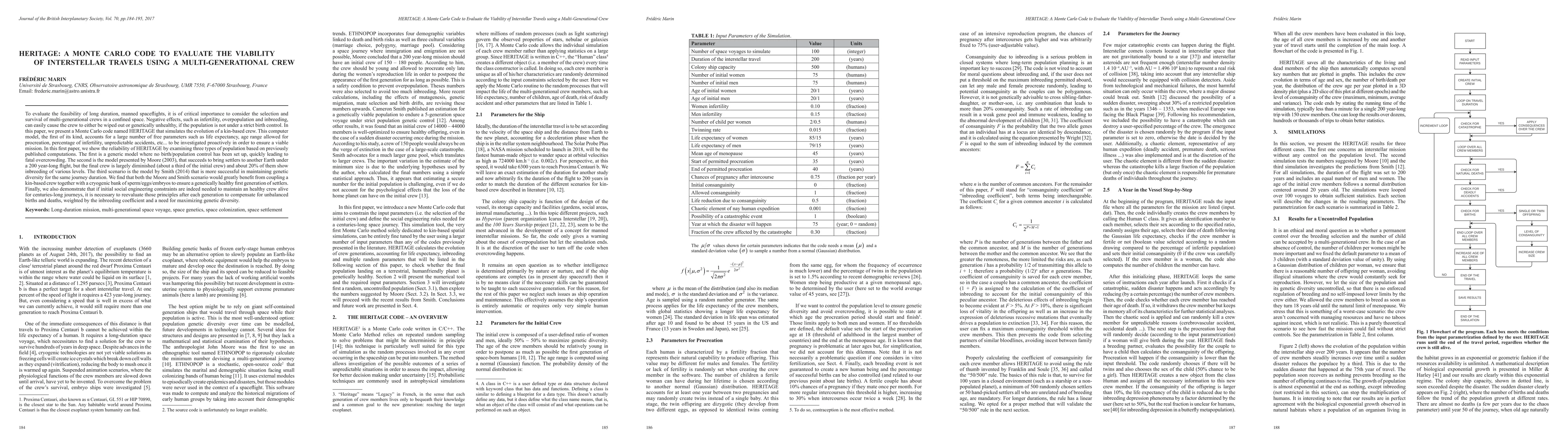 To evaluate the feasibility of long duration, manned spaceflights, it is of critical importance to consider the selection and survival of multi-generational crews in a confined space. Negative effects, such as infertility, overpopulation and inbreeding, can easily cause the crew to either be wiped out or genetically unhealthy, if the population is not under a strict birth control. In this paper, we present a Monte Carlo code named HERITAGE that simulates the evolution of a kin-based crew. This computer model, the first of its kind, accounts for a large number of free human-based parameters to be investigated proactively in order to ensure a viable mission. We show the reliability of HERITAGE by examining three types of population based on previously published computations. The first is a generic model where no birth/population control has been set up, quickly leading to fatal overcrowding. The second is the model presented by Moore (2003), that succeeds to bring settlers to another Earth under a 200 year-long flight, but the final crew is largely diminished (about a third of the initial crew) and about 20% of them show inbreeding of various levels. The third scenario is the model by Smith (2014) that is more successful in maintaining genetic diversity for the same journey duration. We find that both the Moore and Smith scenario would greatly benefit from coupling a kin-based crew together with a cryogenic bank of sperm/eggs/embryos to ensure a genetically healthy first generation of settlers. We also demonstrate that if initial social engineering constraints are indeed needed to maintain an healthy crew alive for centuries-long journeys, it is necessary to reevaluate those principles after each generation to compensate for unbalanced births and deaths, weighted by the inbreeding coefficient and a need for maximizing genetic diversity.