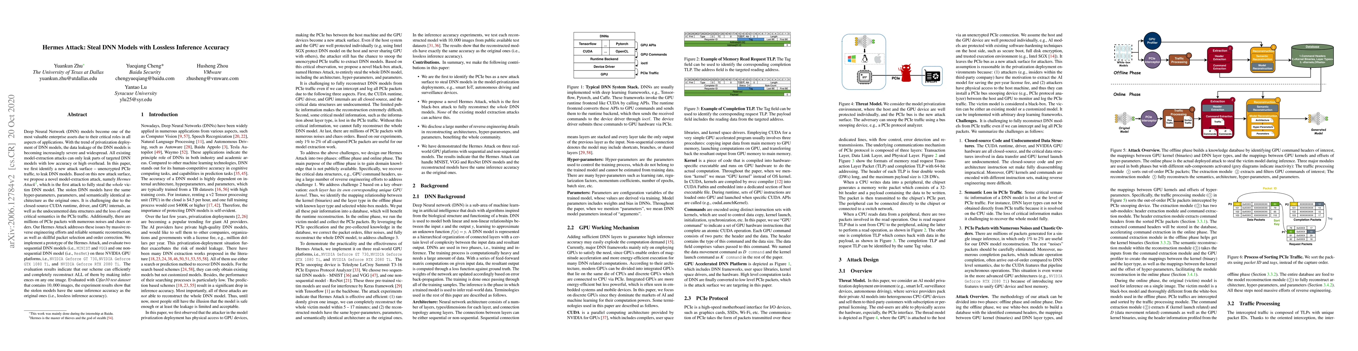 Deep Neural Networks (DNNs) models become one of the most valuable enterprise assets due to their critical roles in all aspects of applications. With the trend of privatization deployment of DNN models, the data leakage of the DNN models is becoming increasingly serious and widespread. All existing model-extraction attacks can only leak parts of targeted DNN models with low accuracy or high overhead. In this paper, we first identify a new attack surface -- unencrypted PCIe traffic, to leak DNN models. Based on this new attack surface, we propose a novel model-extraction attack, namely Hermes Attack, which is the first attack to fully steal the whole victim DNN model. The stolen DNN models have the same hyper-parameters, parameters, and semantically identical architecture as the original ones. It is challenging due to the closed-source CUDA runtime, driver, and GPU internals, as well as the undocumented data structures and the loss of some critical semantics in the PCIe traffic. Additionally, there are millions of PCIe packets with numerous noises and chaos orders. Our Hermes Attack addresses these issues by huge reverse engineering efforts and reliable semantic reconstruction, as well as skillful packet selection and order correction. We implement a prototype of the Hermes Attack, and evaluate two sequential DNN models (i.e., MINIST and VGG) and one consequential DNN model (i.e., ResNet) on three NVIDIA GPU platforms, i.e., NVIDIA Geforce GT 730, NVIDIA Geforce GTX 1080 Ti, and NVIDIA Geforce RTX 2080 Ti. The evaluation results indicate that our scheme is able to efficiently and completely reconstruct ALL of them with making inferences on any one image. Evaluated with Cifar10 test dataset that contains 10,000 images, the experiment results show that the stolen models have the same inference accuracy as the original ones (i.e., lossless inference accuracy).