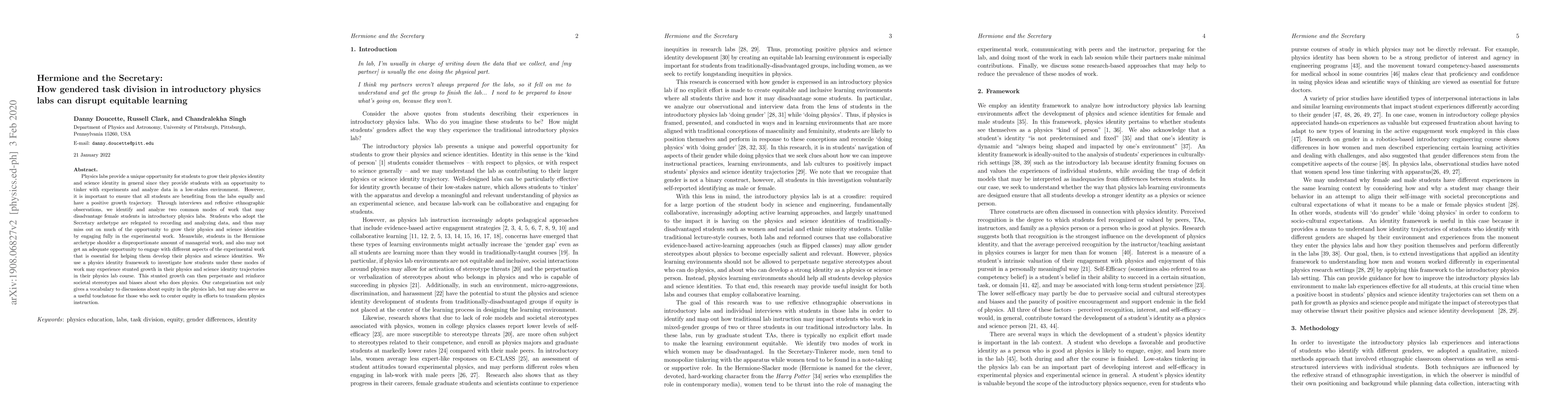 Physics labs provide a unique opportunity for students to grow their physics identity and science identity in general since they provide students with opportunity to tinker with experiments and analyze data in a low-stakes environment. However, it is important to ensure that all students are benefiting from the labs equally and have a positive growth trajectory. Through interviews and reflexive ethnographic observations, we identify and analyze two common modes of work that may disadvantage female students in introductory physics labs. Students who adopt the Secretary archetype are relegated to recording and analyzing data, and thus miss out on much of the opportunity to grow their physics and science identities by engaging fully in the experimental work. Meanwhile, students in the Hermione mode shoulder a disproportionate amount of managerial work, and also do not get adequate opportunity to engage with different aspects of the experimental work that are essential for helping them develop their physics and science identities. Using a physics identity framework, we analyze interviews and observational data to investigate how students under these modes of work may experience stunted growth in their physics and science identity trajectories in their physics lab course. This stunted growth then perpetuates and reinforces societal stereotypes and biases about who does physics. This categorization not only gives a vocabulary to discussions about equity in the lab, but can also serve as a useful touchstone for those who seek to center equity in efforts to transform physics instruction.